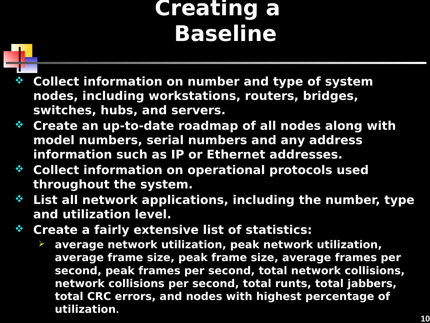 10 .10 Collect information on number and type of system nodes, including workstations, routers, bridges, switches, hubs, and servers. Create an up-to-date roadmap of all nodes along with model numbers, serial numbers and any address information such as IP or Ethernet addresses. Collect information on operational protocols used throughout the system. List all network applications, including the number, type and utilization level. Create a fairly extensive list of statistics: average network utilization, peak network utilization, average frame size, peak frame size, average frames per second, peak frames per second, total network collisions, network collisions per second, total runts, total jabbers, total CRC errors, and nodes with highest percentage of utilization . Creating a Baseline