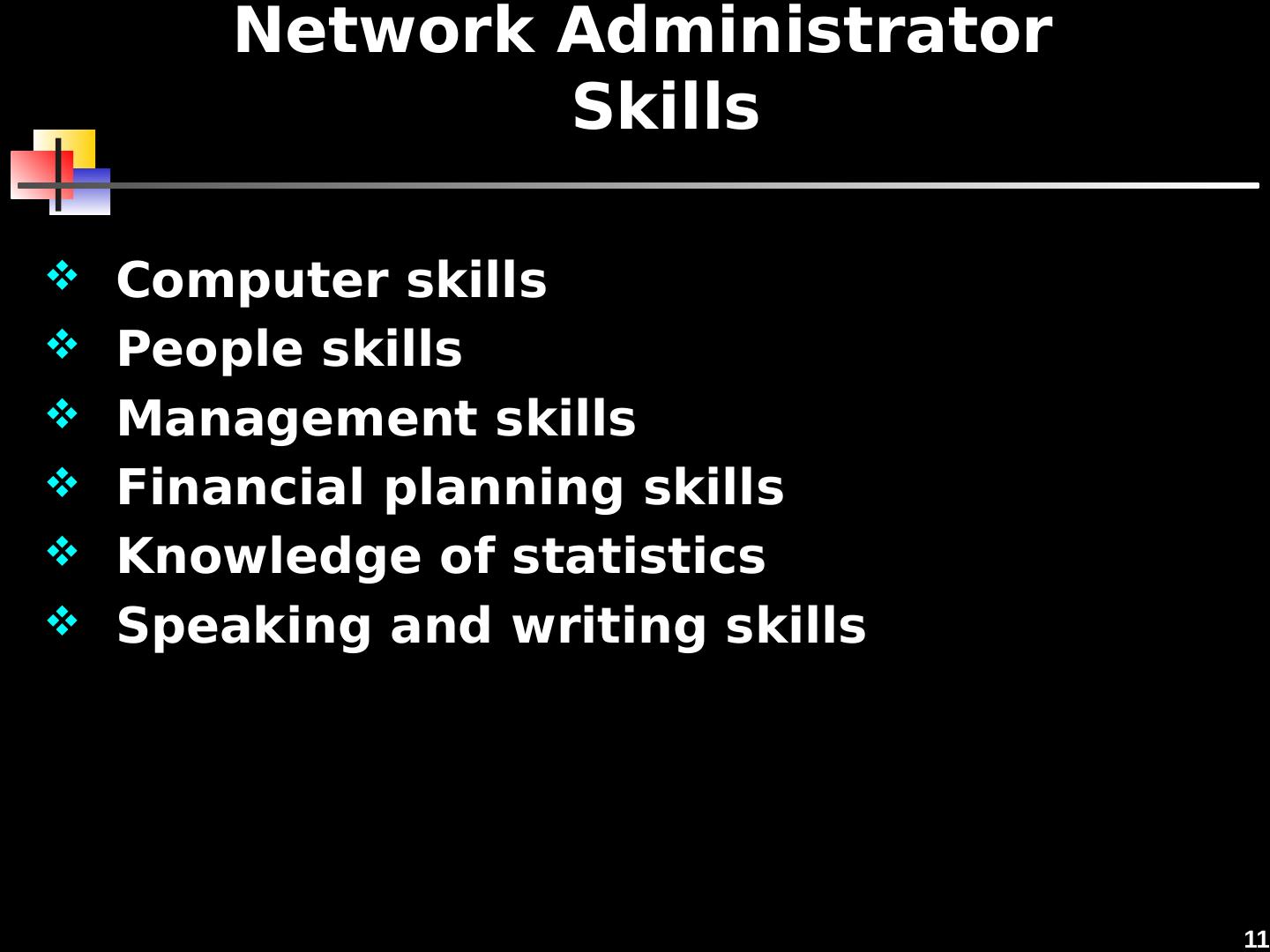 11 .11 Computer skills People skills Management skills Financial planning skills Knowledge of statistics Speaking and writing skills Network Administrator Skills