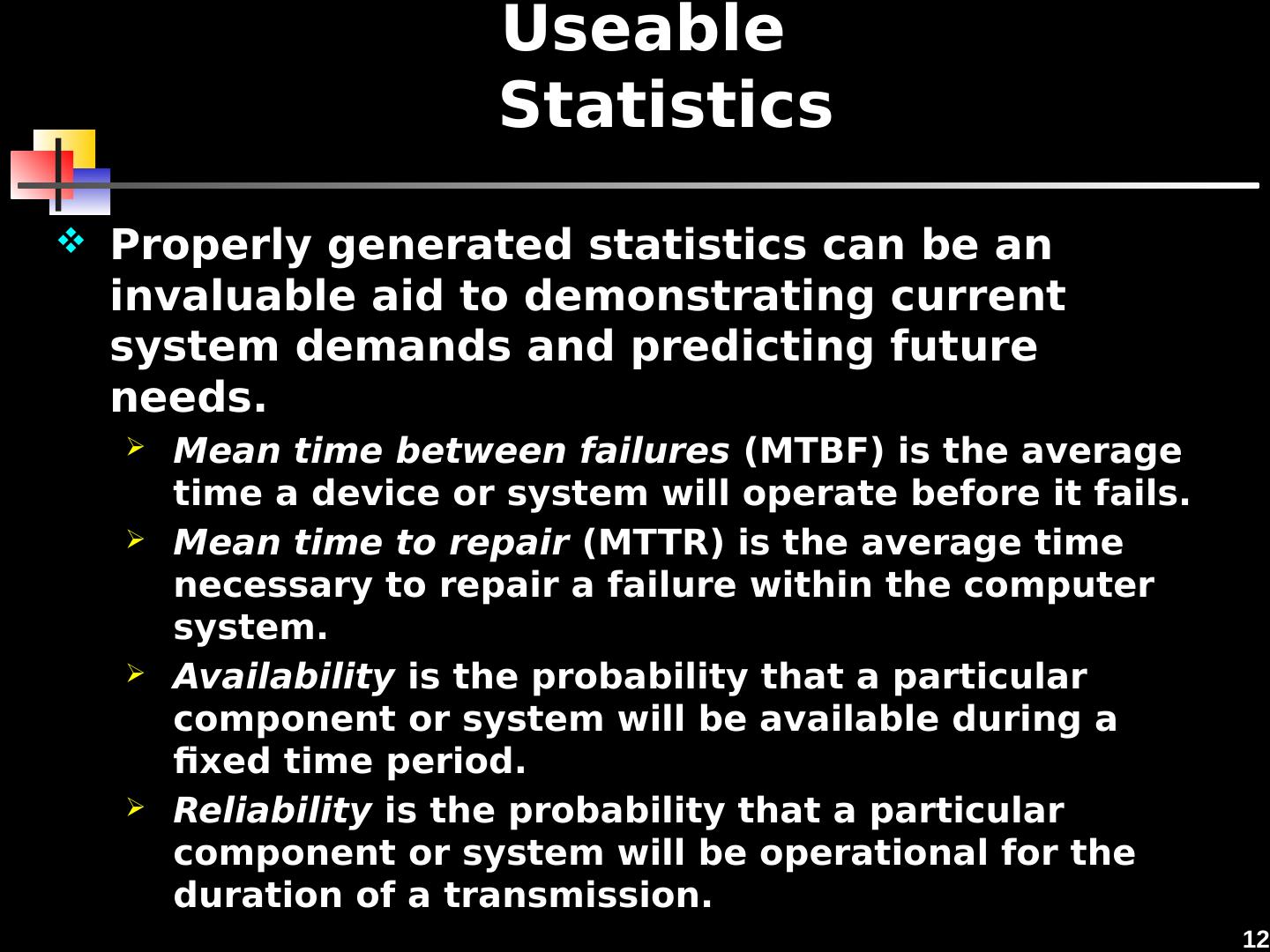 12 .12 Properly generated statistics can be an invaluable aid to demonstrating current system demands and predicting future needs. Mean time between failures (MTBF) is the average time a device or system will operate before it fails. Mean time to repair (MTTR) is the average time necessary to repair a failure within the computer system. Availability is the probability that a particular component or system will be available during a fixed time period. Reliability is the probability that a particular component or system will be operational for the duration of a transmission. Useable Statistics