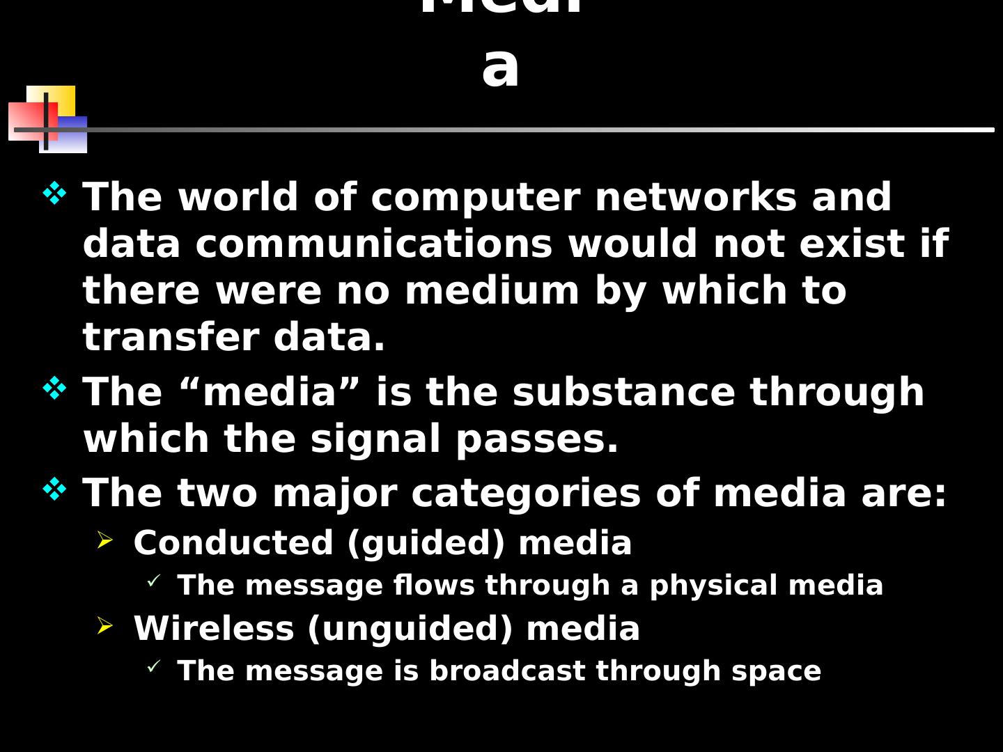 2 .Media The world of computer networks and data communications would not exist if there were no medium by which to transfer data. The “media” is the substance through which the signal passes. The two major categories of media are: Conducted (guided) media The message flows through a physical media Wireless (unguided) media The message is broadcast through space