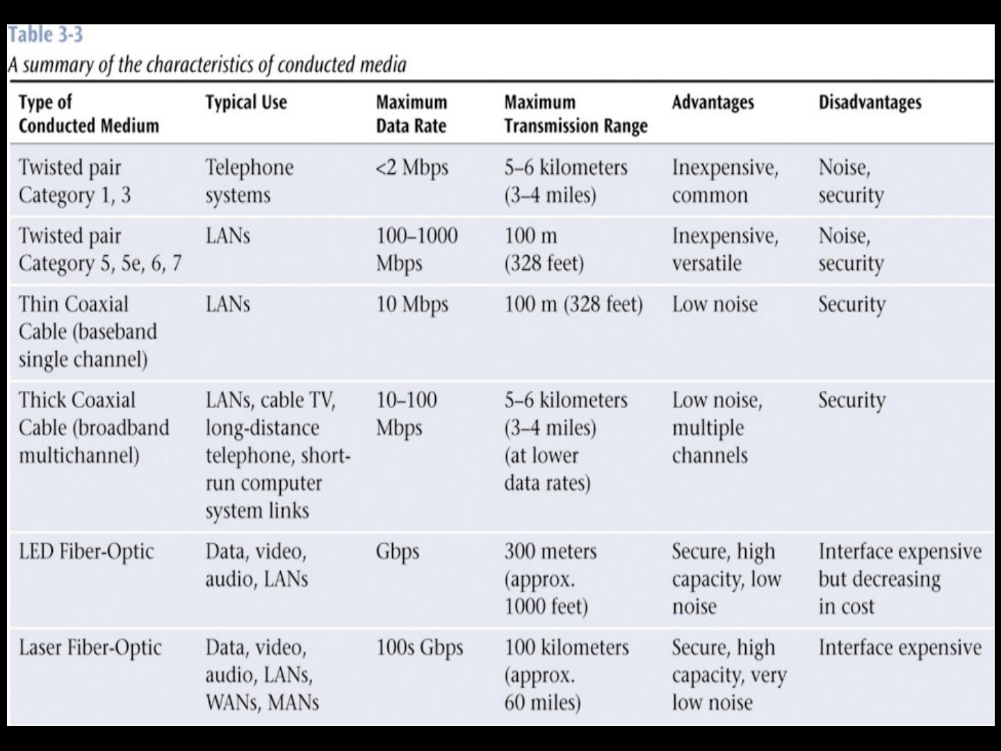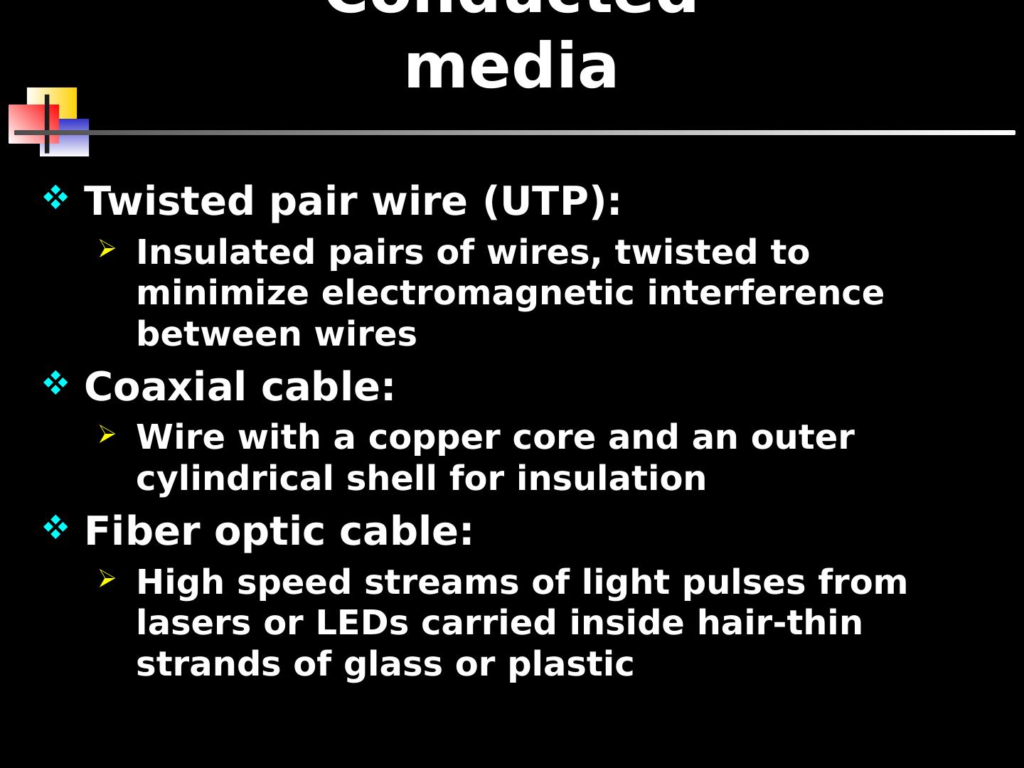 3 .Conducted media Twisted pair wire (UTP): Insulated pairs of wires, twisted to minimize electromagnetic interference between wires Coaxial cable: Wire with a copper core and an outer cylindrical shell for insulation Fiber optic cable: High speed streams of light pulses from lasers or LEDs carried inside hair-thin strands of glass or plastic