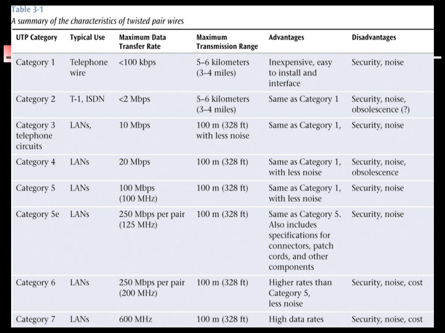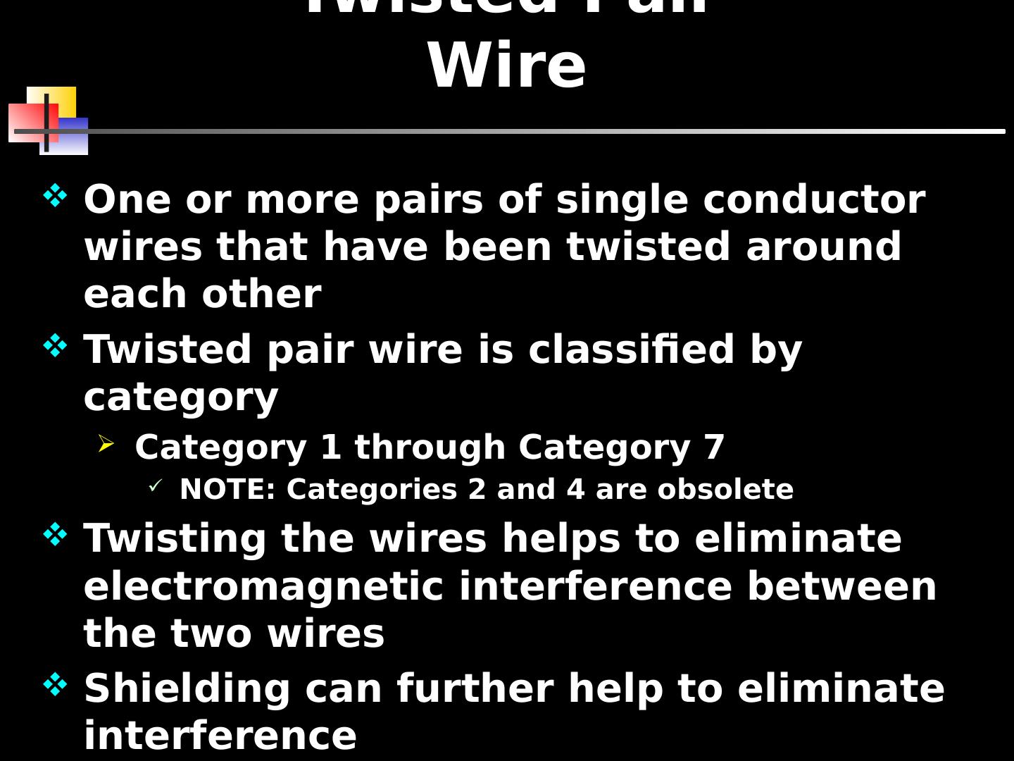 4 .Twisted Pair Wire One or more pairs of single conductor wires that have been twisted around each other Twisted pair wire is classified by category Category 1 through Category 7 NOTE: Categories 2 and 4 are obsolete Twisting the wires helps to eliminate electromagnetic interference between the two wires Shielding can further help to eliminate interference