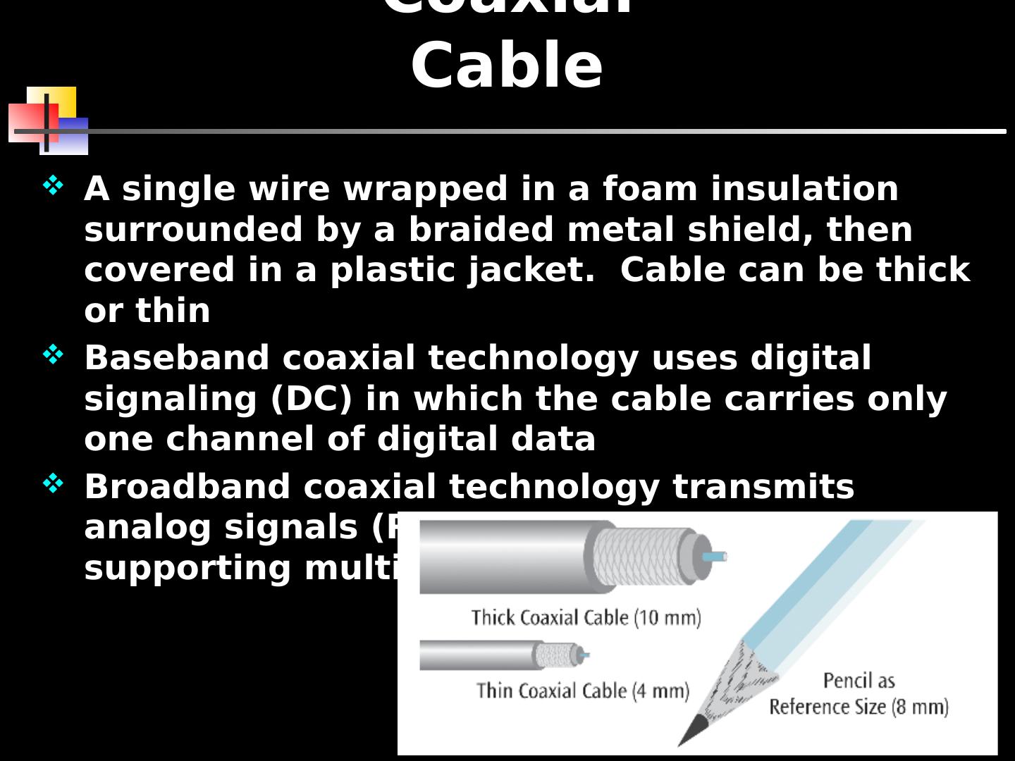 6 .Coaxial Cable A single wire wrapped in a foam insulation surrounded by a braided metal shield, then covered in a plastic jacket. Cable can be thick or thin Baseband coaxial technology uses digital signaling (DC) in which the cable carries only one channel of digital data Broadband coaxial technology transmits analog signals (RF) and is capable of supporting multiple channels of data