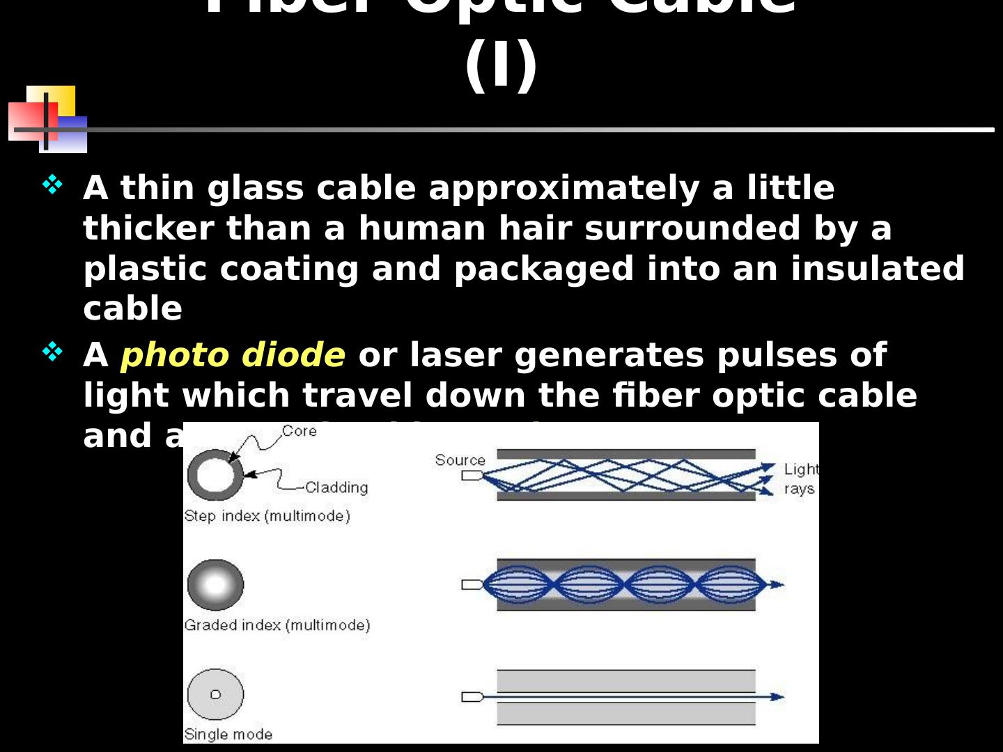 7 .Fiber Optic Cable (I) A thin glass cable approximately a little thicker than a human hair surrounded by a plastic coating and packaged into an insulated cable A photo diode or laser generates pulses of light which travel down the fiber optic cable and are received by a photo receptor