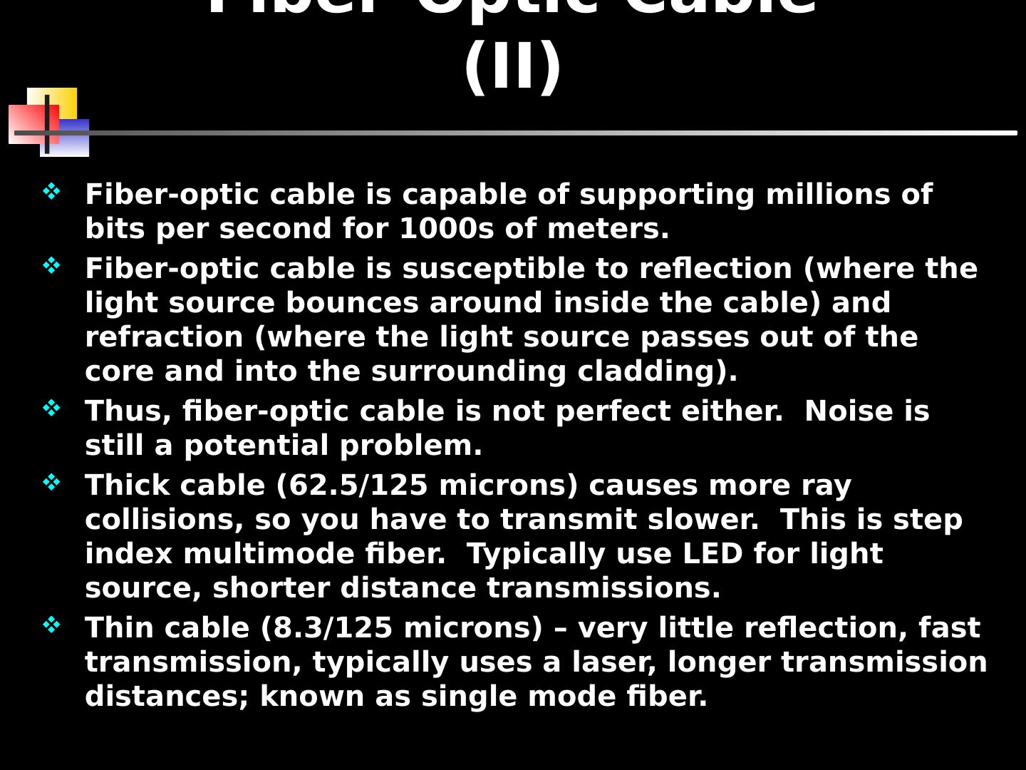 9 .Fiber-Optic Cable (II) Fiber-optic cable is capable of supporting millions of bits per second for 1000s of meters. Fiber-optic cable is susceptible to reflection (where the light source bounces around inside the cable) and refraction (where the light source passes out of the core and into the surrounding cladding). Thus, fiber-optic cable is not perfect either. Noise is still a potential problem. Thick cable (62.5/125 microns) causes more ray collisions, so you have to transmit slower. This is step index multimode fiber. Typically use LED for light source, shorter distance transmissions. Thin cable (8.3/125 microns) – very little reflection, fast transmission, typically uses a laser, longer transmission distances; known as single mode fiber.