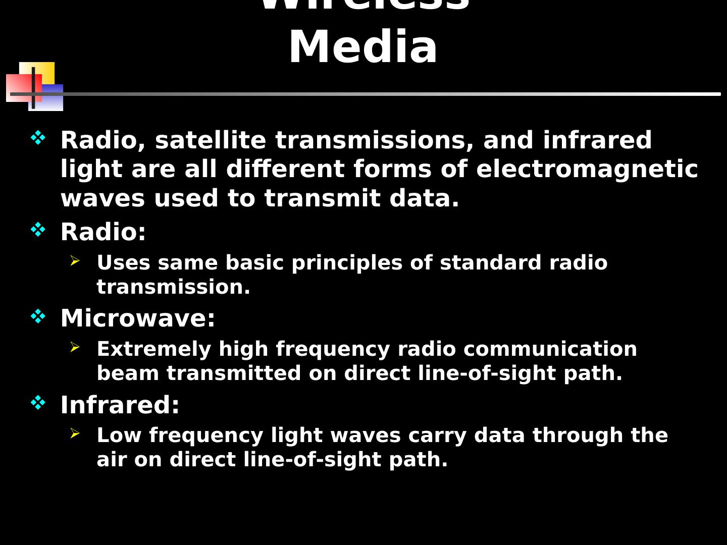 11 .Wireless Media Radio, satellite transmissions, and infrared light are all different forms of electromagnetic waves used to transmit data. Radio: Uses same basic principles of standard radio transmission. Microwave: Extremely high frequency radio communication beam transmitted on direct line-of-sight path. Infrared: Low frequency light waves carry data through the air on direct line-of-sight path.