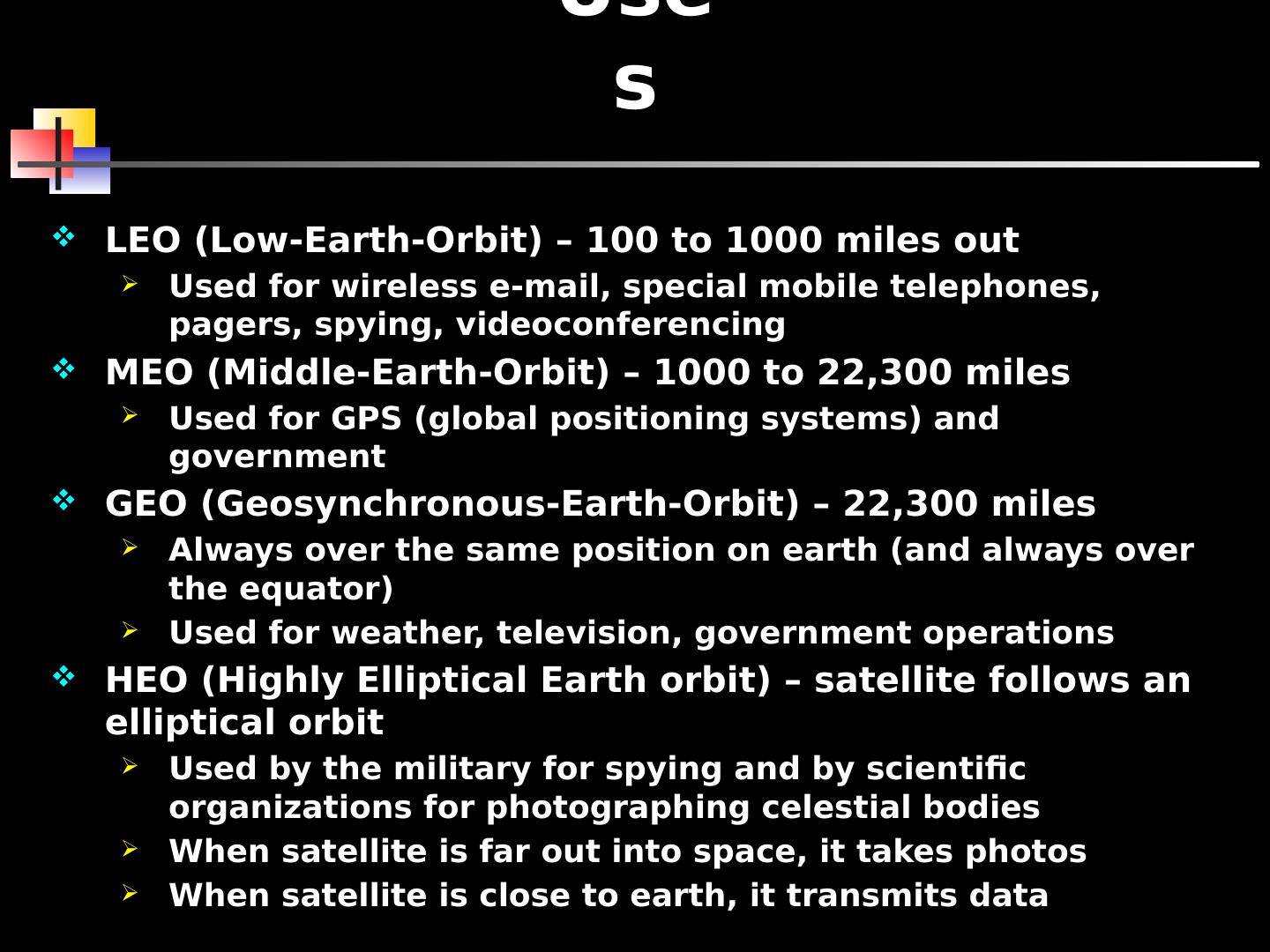 15 .Uses LEO (Low-Earth-Orbit) – 100 to 1000 miles out Used for wireless e-mail, special mobile telephones, pagers, spying, videoconferencing MEO (Middle-Earth-Orbit) – 1000 to 22,300 miles Used for GPS (global positioning systems) and government GEO (Geosynchronous-Earth-Orbit) – 22,300 miles Always over the same position on earth (and always over the equator) Used for weather, television, government operations HEO (Highly Elliptical Earth orbit) – satellite follows an elliptical orbit Used by the military for spying and by scientific organizations for photographing celestial bodies When satellite is far out into space, it takes photos When satellite is close to earth, it transmits data