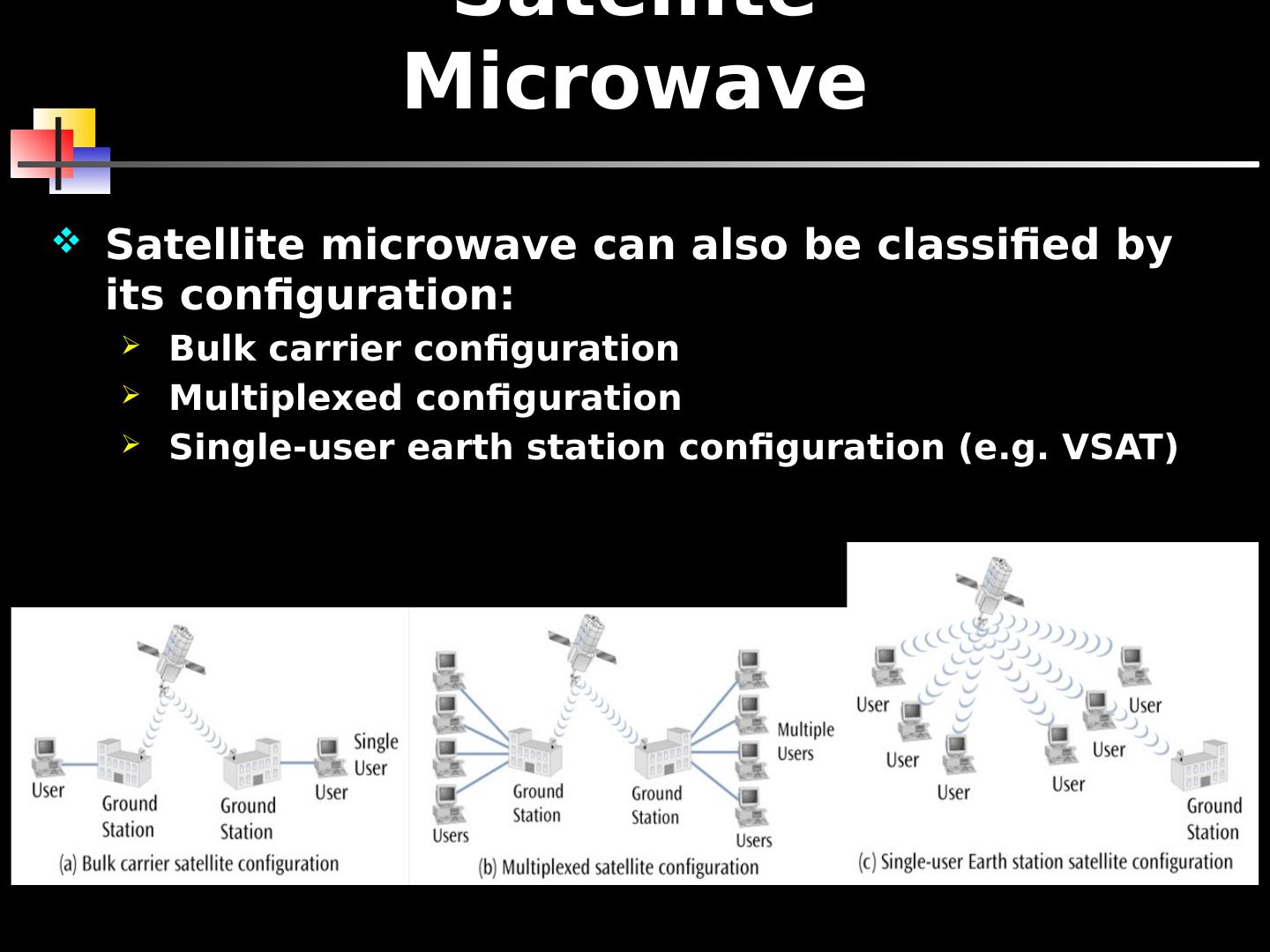 16 .Satellite Microwave Satellite microwave can also be classified by its configuration: Bulk carrier configuration Multiplexed configuration Single-user earth station configuration (e.g. VSAT)