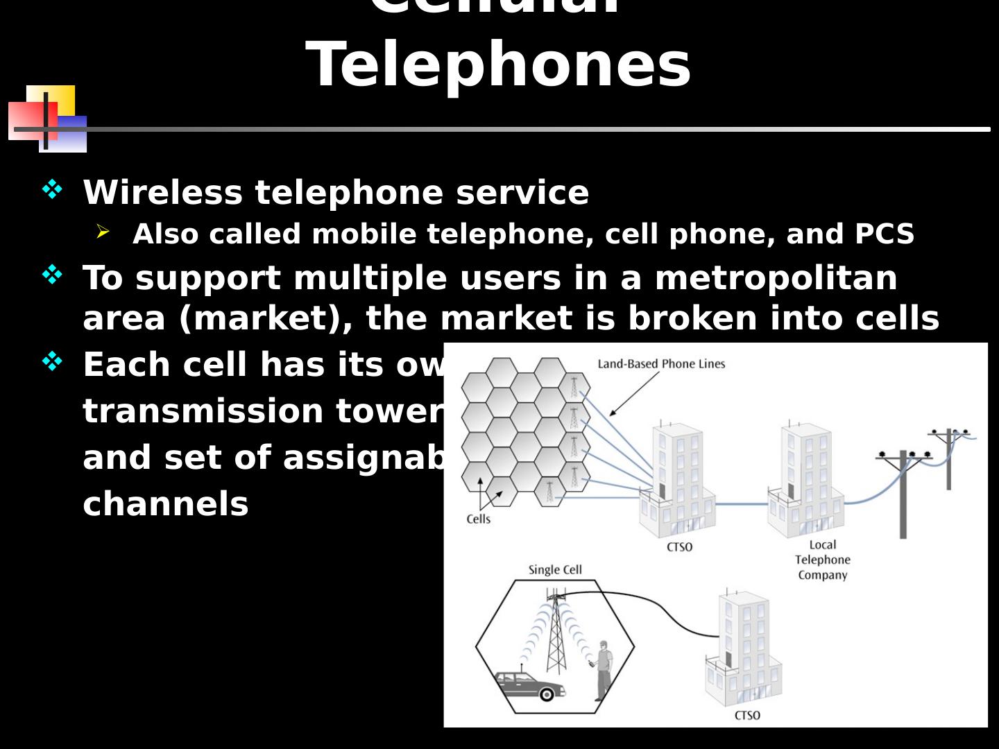 17 .Cellular Telephones Wireless telephone service Also called mobile telephone, cell phone, and PCS To support multiple users in a metropolitan area (market), the market is broken into cells Each cell has its own transmission tower and set of assignable channels