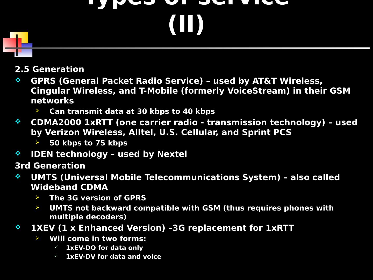 18 .Types of service (I) 1st Generation AMPS (Advanced Mobile Phone Service) - first popular mobile phone service Uses analog signals and dynamically assigned channels D-AMPS (Digital Advanced Mobile Phone Service) - applies digital multiplexing techniques on top of AMPS analog channels 2nd Generation PCS (Personal Communication Systems) - all-digital mobile phone service 2nd generation PCS phones came in three technologies: TDMA - Time division multiple access CDMA - Code division multiple access GSM - Global system for mobile communications