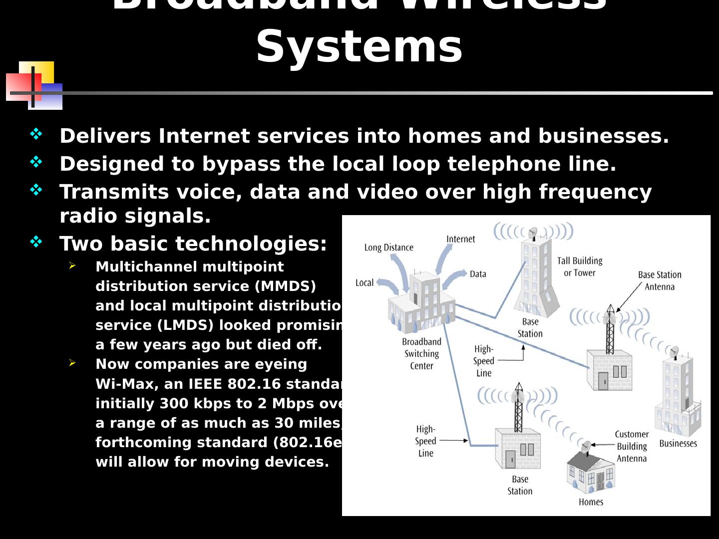 20 .Broadband Wireless Systems Delivers Internet services into homes and businesses. Designed to bypass the local loop telephone line. Transmits voice, data and video over high frequency radio signals. Two basic technologies: Multichannel multipoint distribution service (MMDS) and local multipoint distribution service (LMDS) looked promising a few years ago but died off. Now companies are eyeing Wi-Max, an IEEE 802.16 standard; initially 300 kbps to 2 Mbps over a range of as much as 30 miles; forthcoming standard (802.16e) will allow for moving devices.