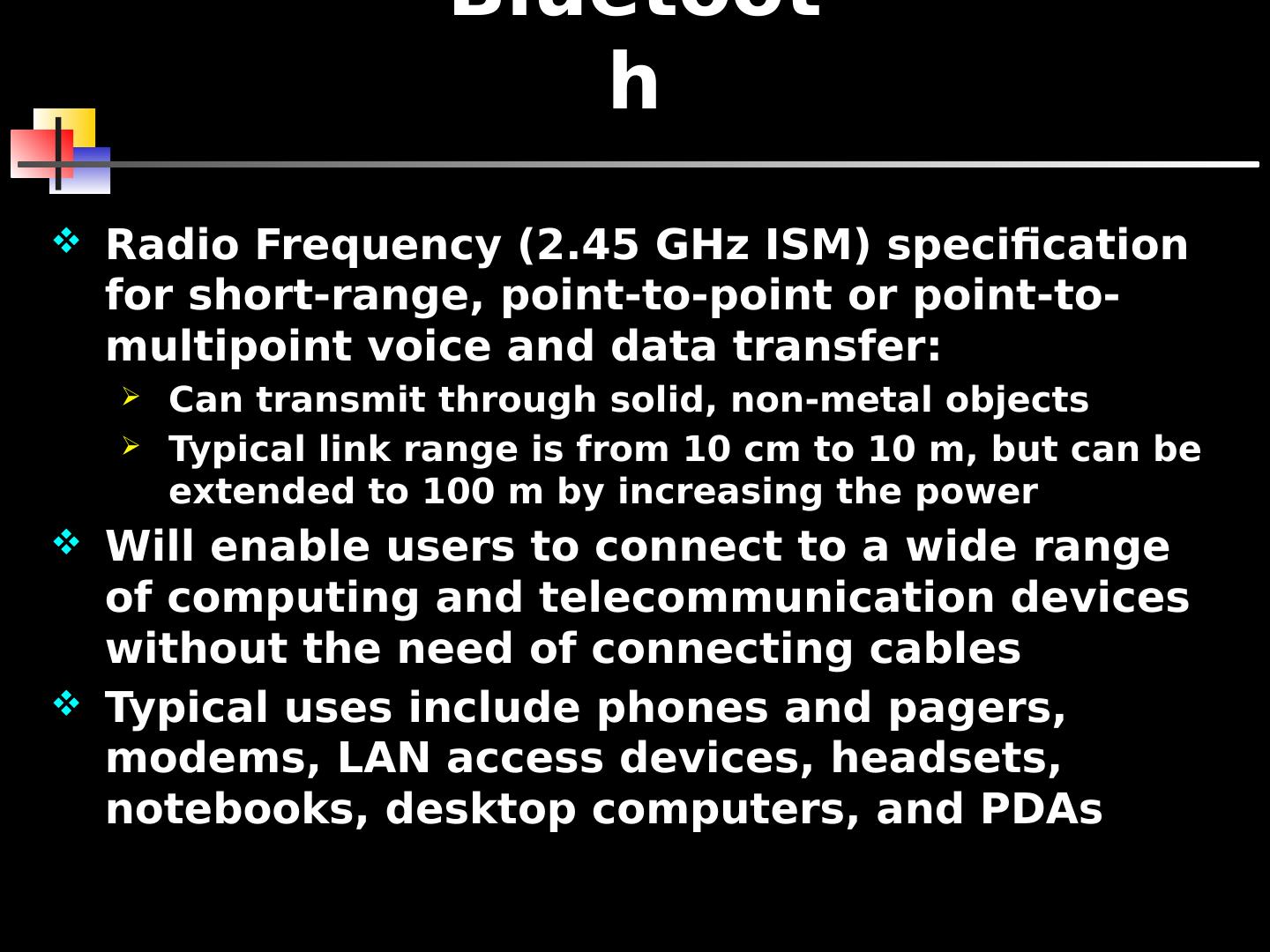 21 .Bluetooth Radio Frequency (2.45 GHz ISM) specification for short-range, point-to-point or point-to-multipoint voice and data transfer: Can transmit through solid, non-metal objects Typical link range is from 10 cm to 10 m, but can be extended to 100 m by increasing the power Will enable users to connect to a wide range of computing and telecommunication devices without the need of connecting cables Typical uses include phones and pagers, modems, LAN access devices, headsets, notebooks, desktop computers, and PDAs