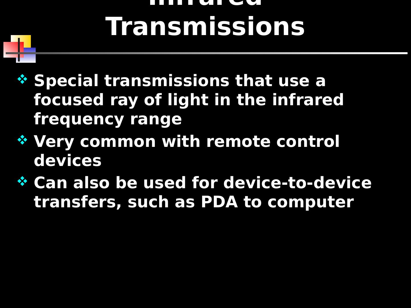 23 .Infrared Transmissions Special transmissions that use a focused ray of light in the infrared frequency range Very common with remote control devices Can also be used for device-to-device transfers, such as PDA to computer