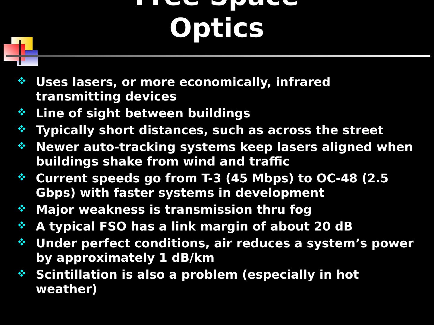 24 .Free Space Optics Uses lasers, or more economically, infrared transmitting devices Line of sight between buildings Typically short distances, such as across the street Newer auto-tracking systems keep lasers aligned when buildings shake from wind and traffic Current speeds go from T-3 (45 Mbps) to OC-48 (2.5 Gbps) with faster systems in development Major weakness is transmission thru fog A typical FSO has a link margin of about 20 dB Under perfect conditions, air reduces a system’s power by approximately 1 dB/km Scintillation is also a problem (especially in hot weather)