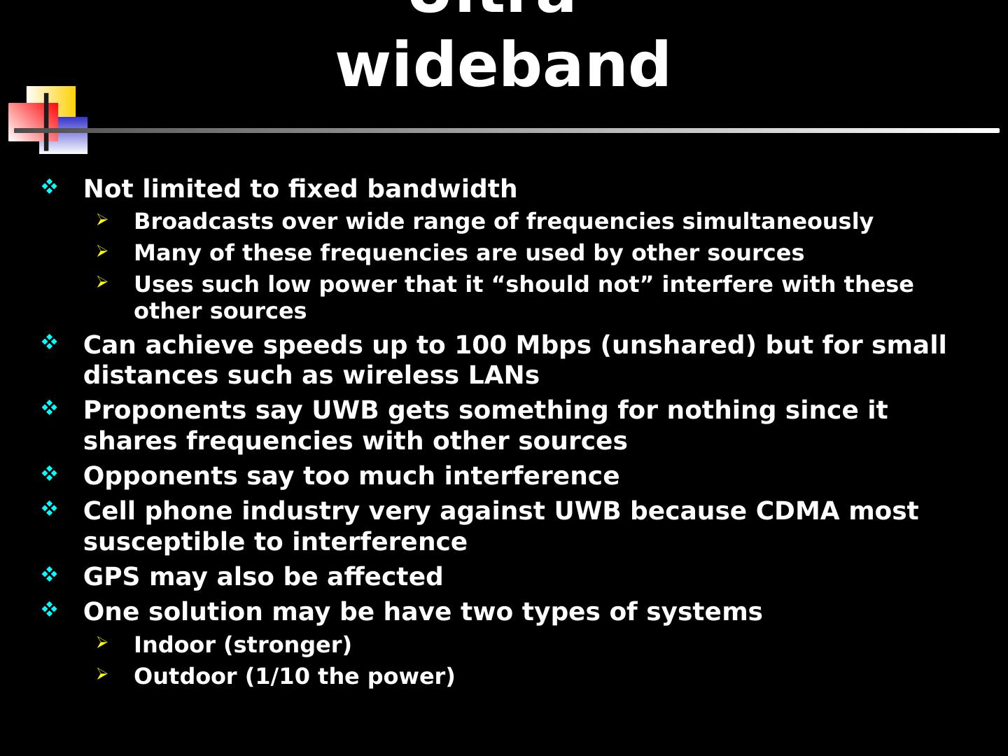 25 .Ultra-wideband Not limited to fixed bandwidth Broadcasts over wide range of frequencies simultaneously Many of these frequencies are used by other sources Uses such low power that it “should not” interfere with these other sources Can achieve speeds up to 100 Mbps (unshared) but for small distances such as wireless LANs Proponents say UWB gets something for nothing since it shares frequencies with other sources Opponents say too much interference Cell phone industry very against UWB because CDMA most susceptible to interference GPS may also be affected One solution may be have two types of systems Indoor (stronger) Outdoor (1/10 the power)