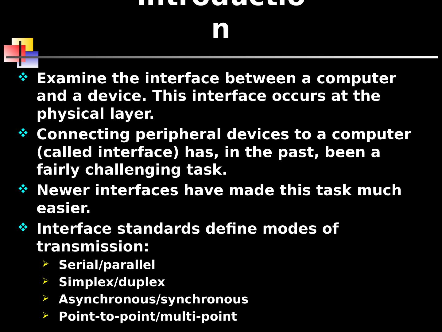 2 .Introduction Examine the interface between a computer and a device. This interface occurs at the physical layer. Connecting peripheral devices to a computer (called interface) has, in the past, been a fairly challenging task. Newer interfaces have made this task much easier. Interface standards define modes of transmission: Serial/parallel Simplex/duplex Asynchronous/synchronous Point-to-point/multi-point