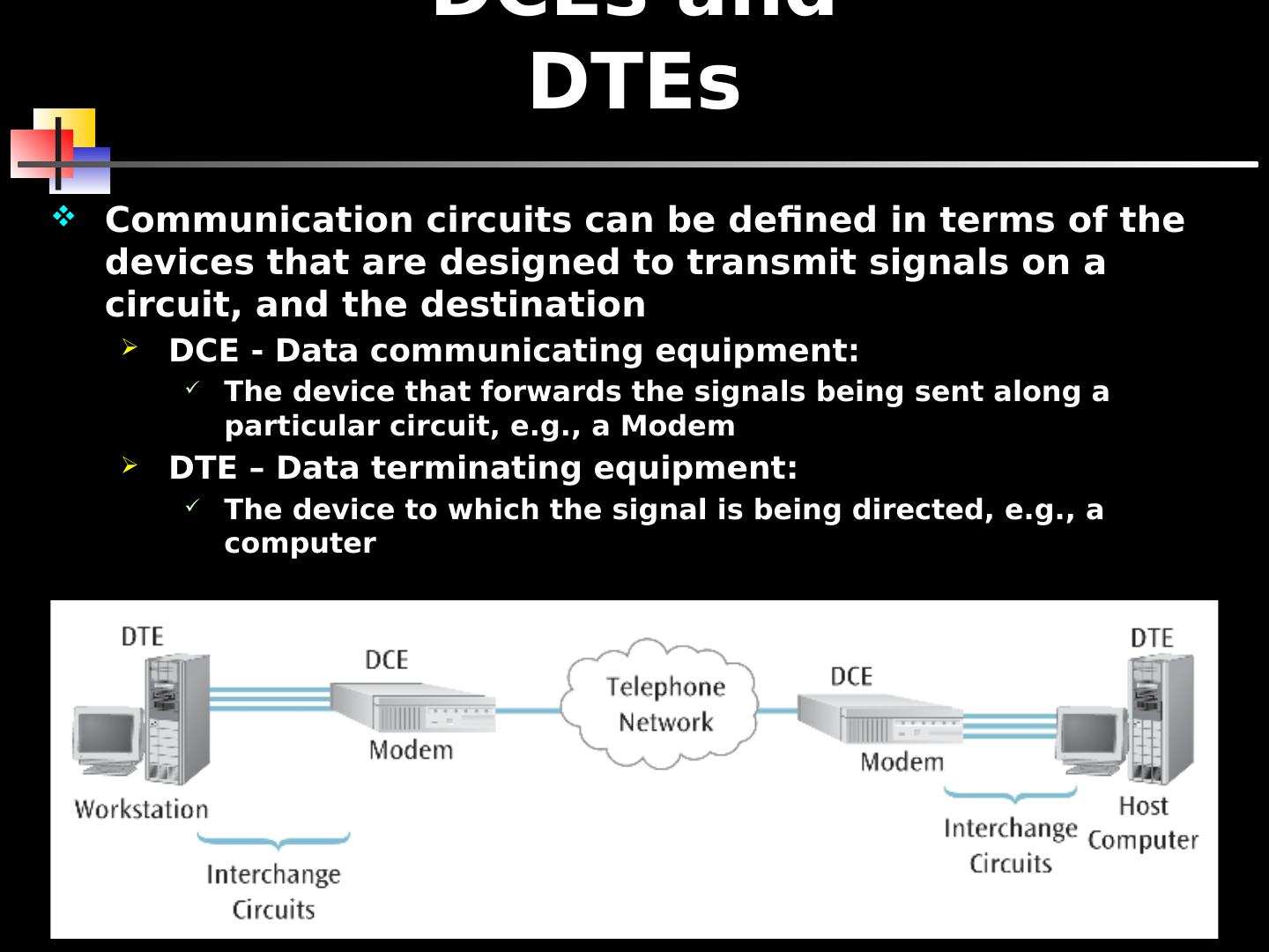 4 .DCEs and DTEs Communication circuits can be defined in terms of the devices that are designed to transmit signals on a circuit, and the destination DCE - Data communicating equipment: The device that forwards the signals being sent along a particular circuit, e.g., a Modem DTE – Data terminating equipment: The device to which the signal is being directed, e.g., a computer
