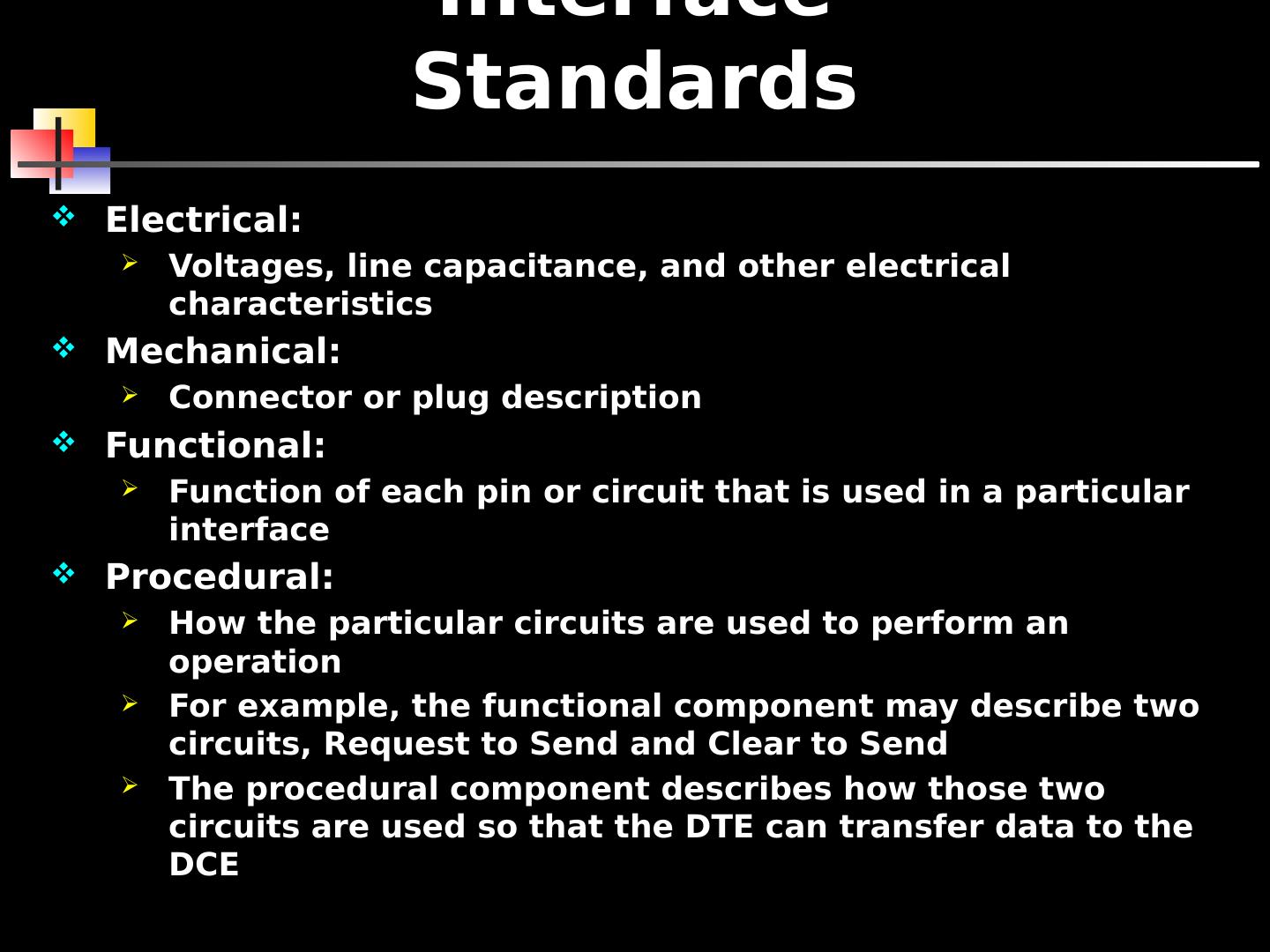 5 .Interface Standards Electrical: Voltages, line capacitance, and other electrical characteristics Mechanical: Connector or plug description Functional: Function of each pin or circuit that is used in a particular interface Procedural: How the particular circuits are used to perform an operation For example, the functional component may describe two circuits, Request to Send and Clear to Send The procedural component describes how those two circuits are used so that the DTE can transfer data to the DCE