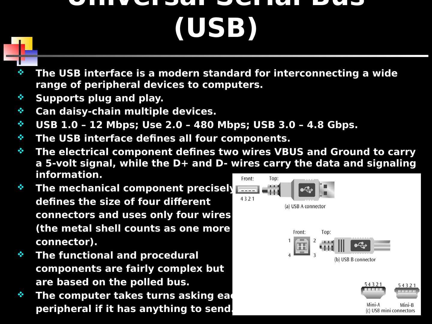 12 .Universal Serial Bus (USB) The USB interface is a modern standard for interconnecting a wide range of peripheral devices to computers. Supports plug and play. Can daisy-chain multiple devices. USB 1.0 – 12 Mbps; Use 2.0 – 480 Mbps; USB 3.0 – 4.8 Gbps . The USB interface defines all four components. The electrical component defines two wires VBUS and Ground to carry a 5-volt signal, while the D+ and D- wires carry the data and signaling information. The mechanical component precisely defines the size of four different connectors and uses only four wires (the metal shell counts as one more connector). The functional and procedural components are fairly complex but are based on the polled bus. The computer takes turns asking each peripheral if it has anything to send.