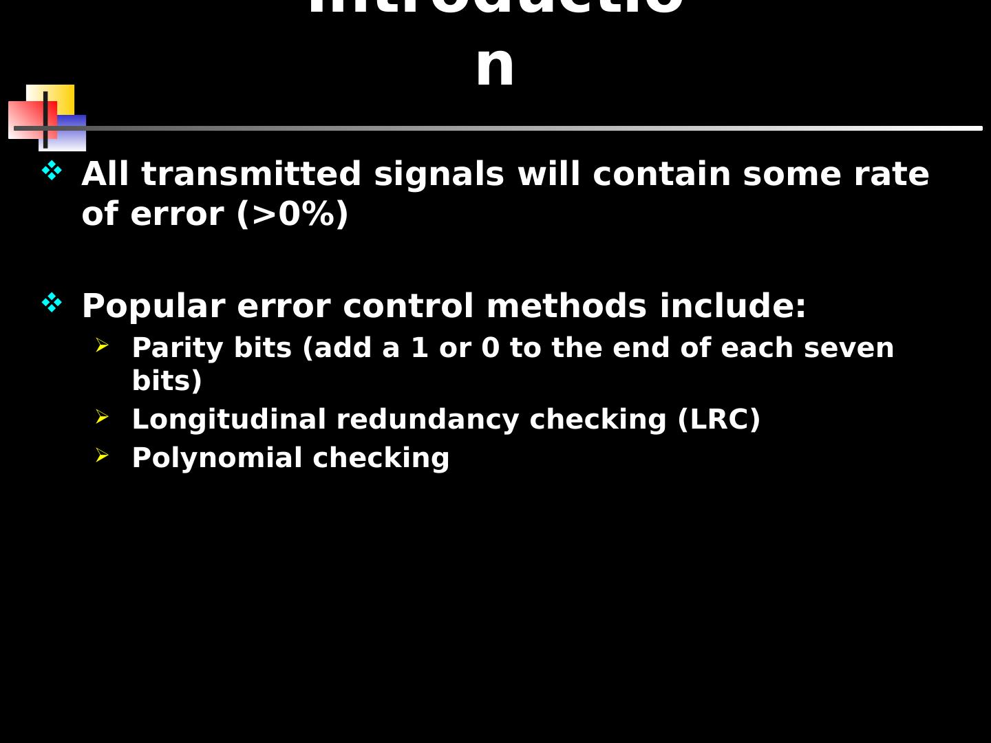 2 .Introduction All transmitted signals will contain some rate of error (>0%) Popular error control methods include: Parity bits (add a 1 or 0 to the end of each seven bits) Longitudinal redundancy checking (LRC) Polynomial checking