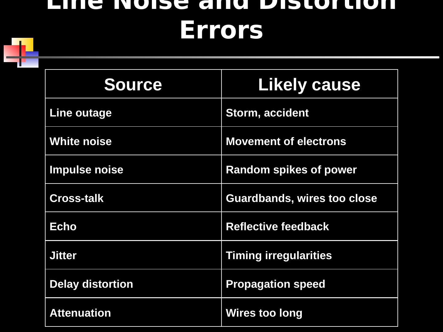 4 .Line Noise and Distortion Errors Likely cause Line outage White noise Impulse noise Cross-talk Attenuation Echo Jitter Delay distortion Source Storm, accident Movement of electrons Random spikes of power Guardbands, wires too close Wires too long Reflective feedback Timing irregularities Propagation speed