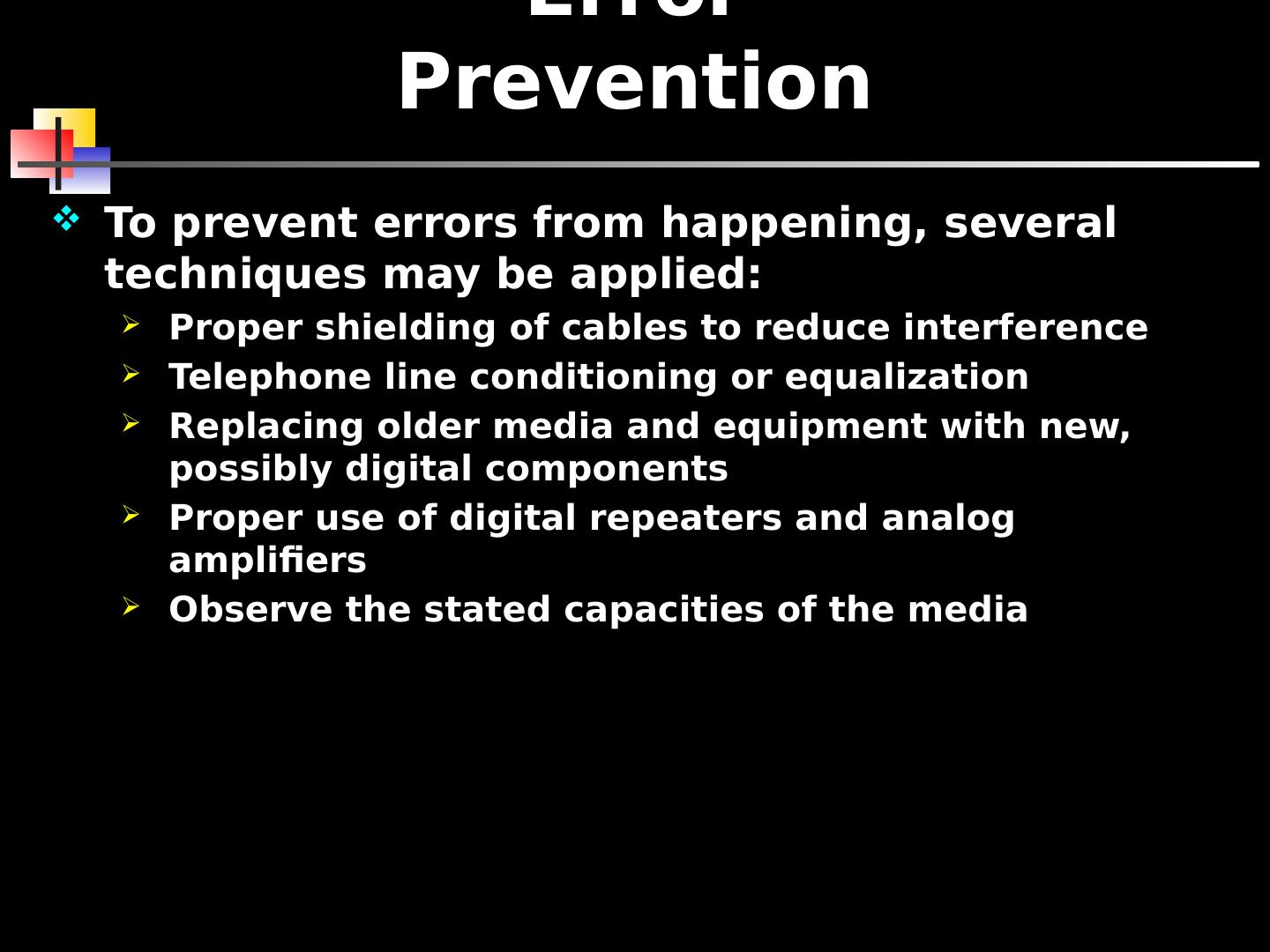 5 .Error Prevention To prevent errors from happening, several techniques may be applied: Proper shielding of cables to reduce interference Telephone line conditioning or equalization Replacing older media and equipment with new, possibly digital components Proper use of digital repeaters and analog amplifiers Observe the stated capacities of the media