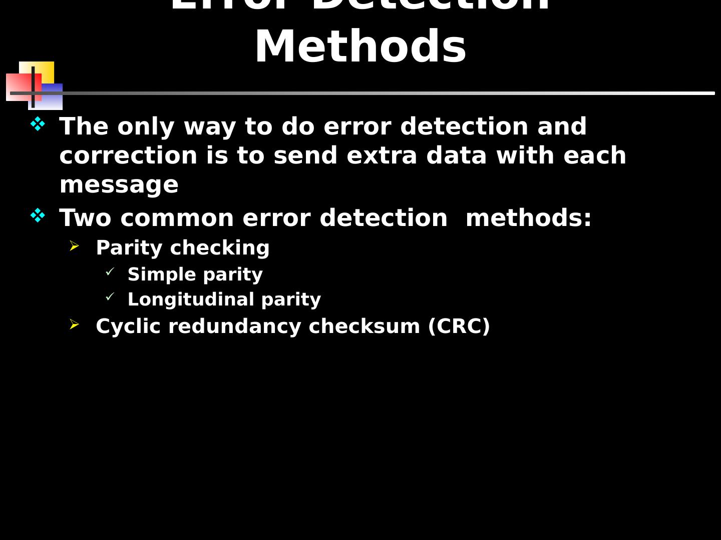 7 .Error Detection Methods The only way to do error detection and correction is to send extra data with each message Two common error detection methods: Parity checking Simple parity Longitudinal parity Cyclic redundancy checksum (CRC)