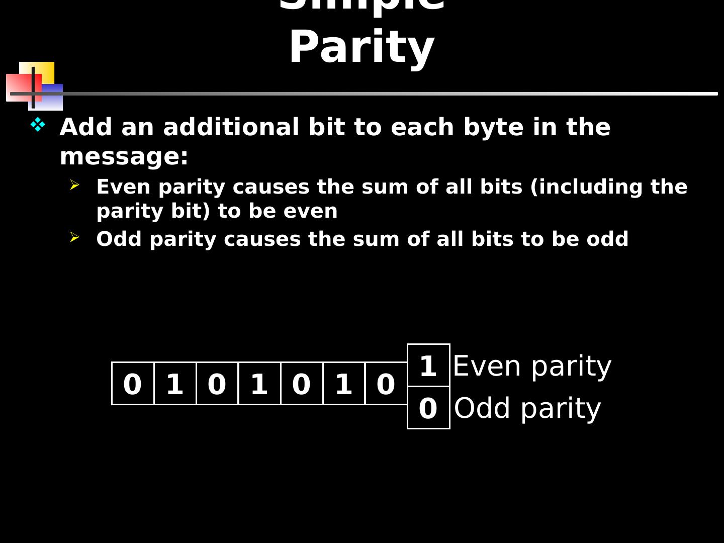 8 .Simple Parity Add an additional bit to each byte in the message: Even parity causes the sum of all bits (including the parity bit) to be even Odd parity causes the sum of all bits to be odd 0 1 0 1 0 1 0 1 Even parity 0 Odd parity