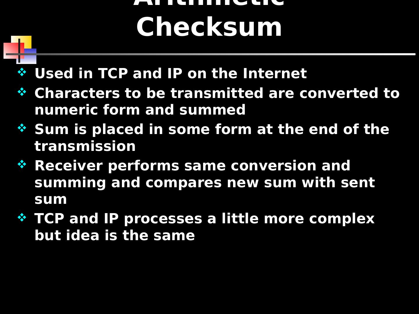 13 .Arithmetic Checksum Used in TCP and IP on the Internet Characters to be transmitted are converted to numeric form and summed Sum is placed in some form at the end of the transmission Receiver performs same conversion and summing and compares new sum with sent sum TCP and IP processes a little more complex but idea is the same