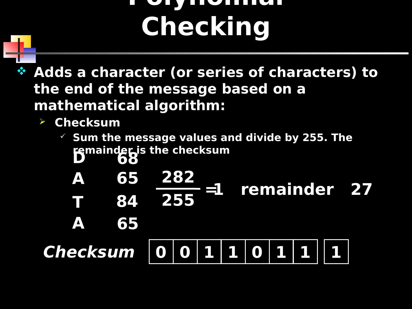 14 .Polynomial Checking Adds a character (or series of characters) to the end of the message based on a mathematical algorithm: Checksum Sum the message values and divide by 255. The remainder is the checksum D A T A 68 65 84 65 282 255 = 1 remainder 27 0 0 1 1 0 1 1 1 Checksum