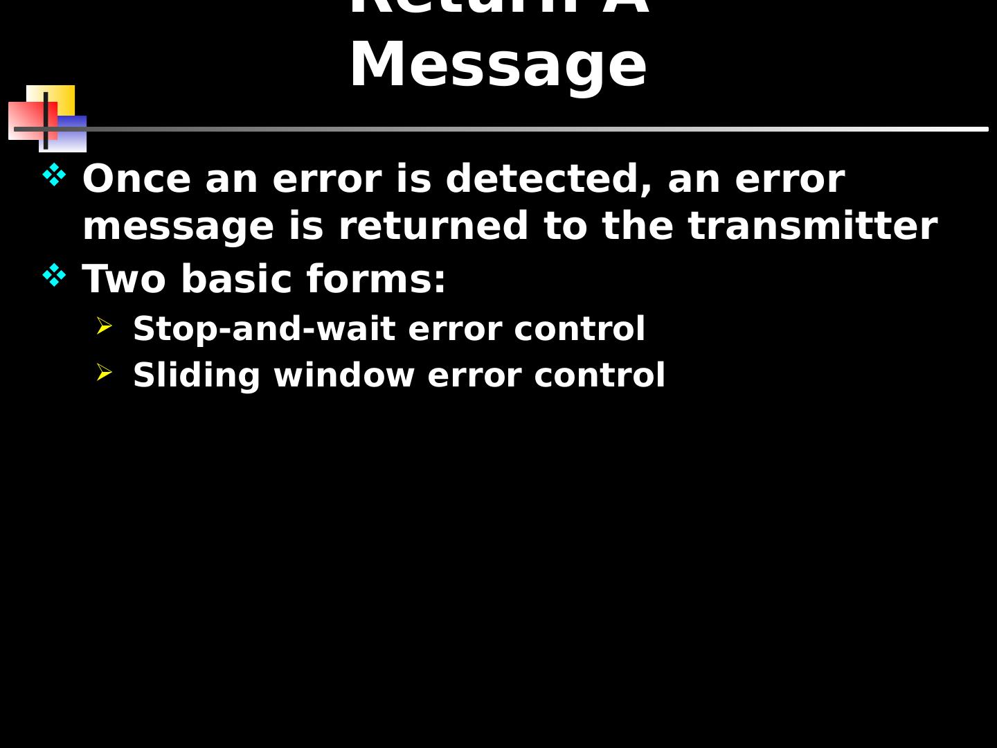 20 .Return A Message Once an error is detected, an error message is returned to the transmitter Two basic forms: Stop-and-wait error control Sliding window error control