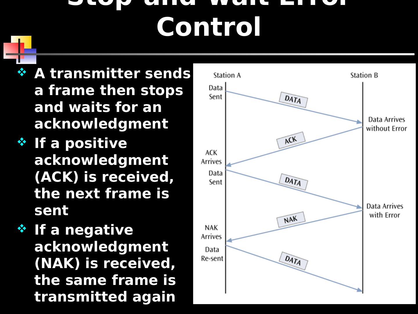 21 .Stop-and-wait Error Control A transmitter sends a frame then stops and waits for an acknowledgment If a positive acknowledgment (ACK) is received, the next frame is sent If a negative acknowledgment (NAK) is received, the same frame is transmitted again