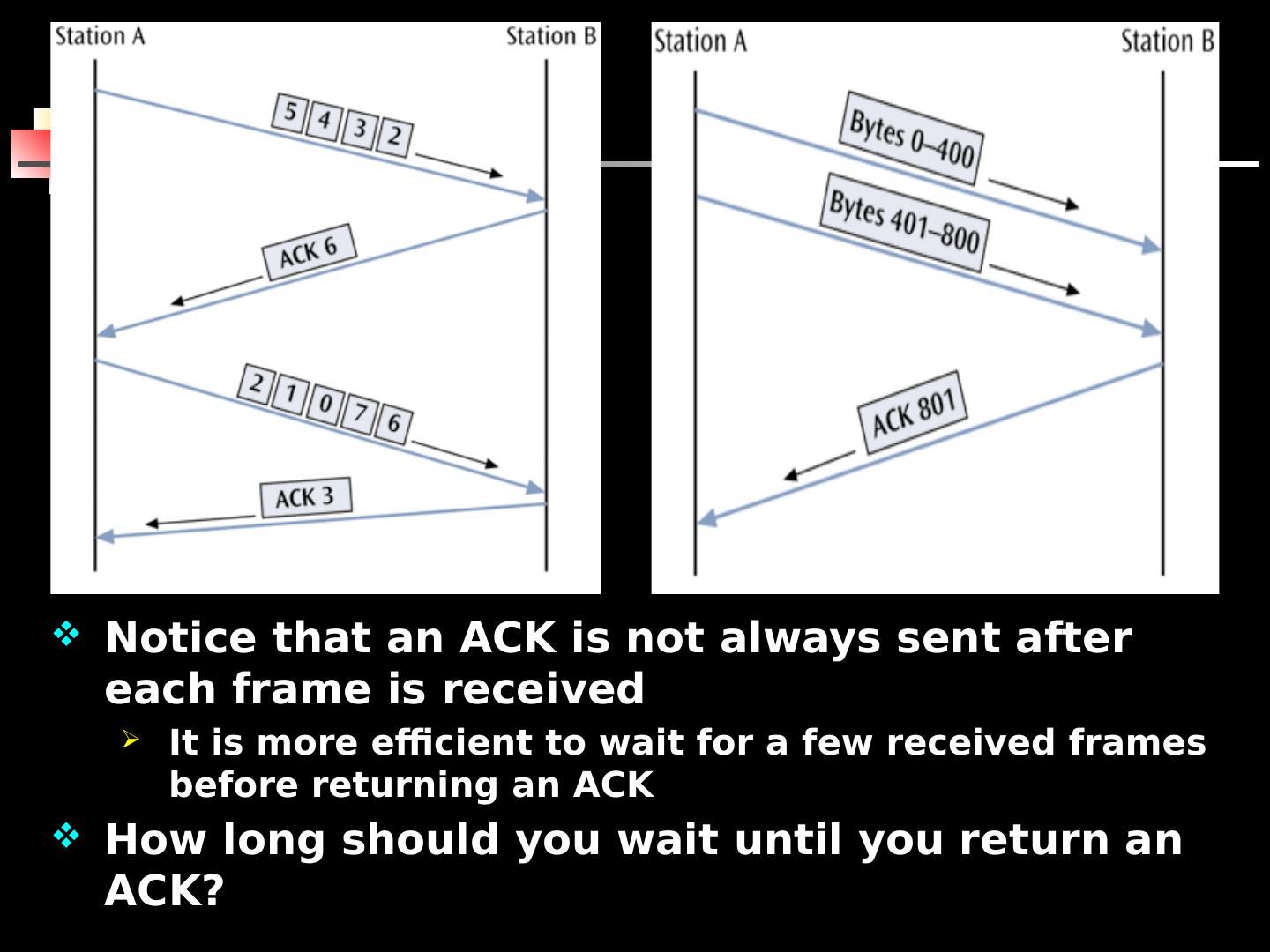 23 .Notice that an ACK is not always sent after each frame is received It is more efficient to wait for a few received frames before returning an ACK How long should you wait until you return an ACK? 23