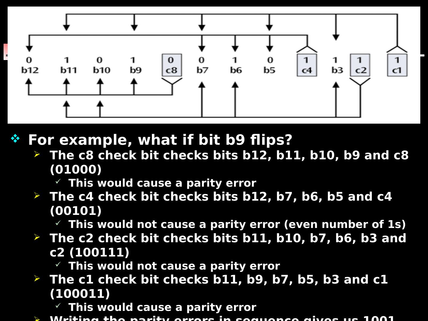 28 .For example, what if bit b9 flips? The c8 check bit checks bits b12, b11, b10, b9 and c8 (01000) This would cause a parity error The c4 check bit checks bits b12, b7, b6, b5 and c4 (00101) This would not cause a parity error (even number of 1s) The c2 check bit checks bits b11, b10, b7, b6, b3 and c2 (100111) This would not cause a parity error The c1 check bit checks b11, b9, b7, b5, b3 and c1 (100011) This would cause a parity error Writing the parity errors in sequence gives us 1001, which is binary for the value 9 Thus, the bit error occurred in the 9th position 28