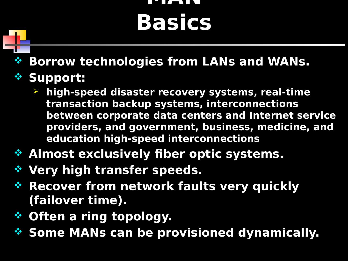 2 .MAN Basics Borrow technologies from LANs and WANs. Support: high-speed disaster recovery systems, real-time transaction backup systems, interconnections between corporate data centers and Internet service providers, and government, business, medicine, and education high-speed interconnections Almost exclusively fiber optic systems. Very high transfer speeds. Recover from network faults very quickly (failover time). Often a ring topology. Some MANs can be provisioned dynamically.