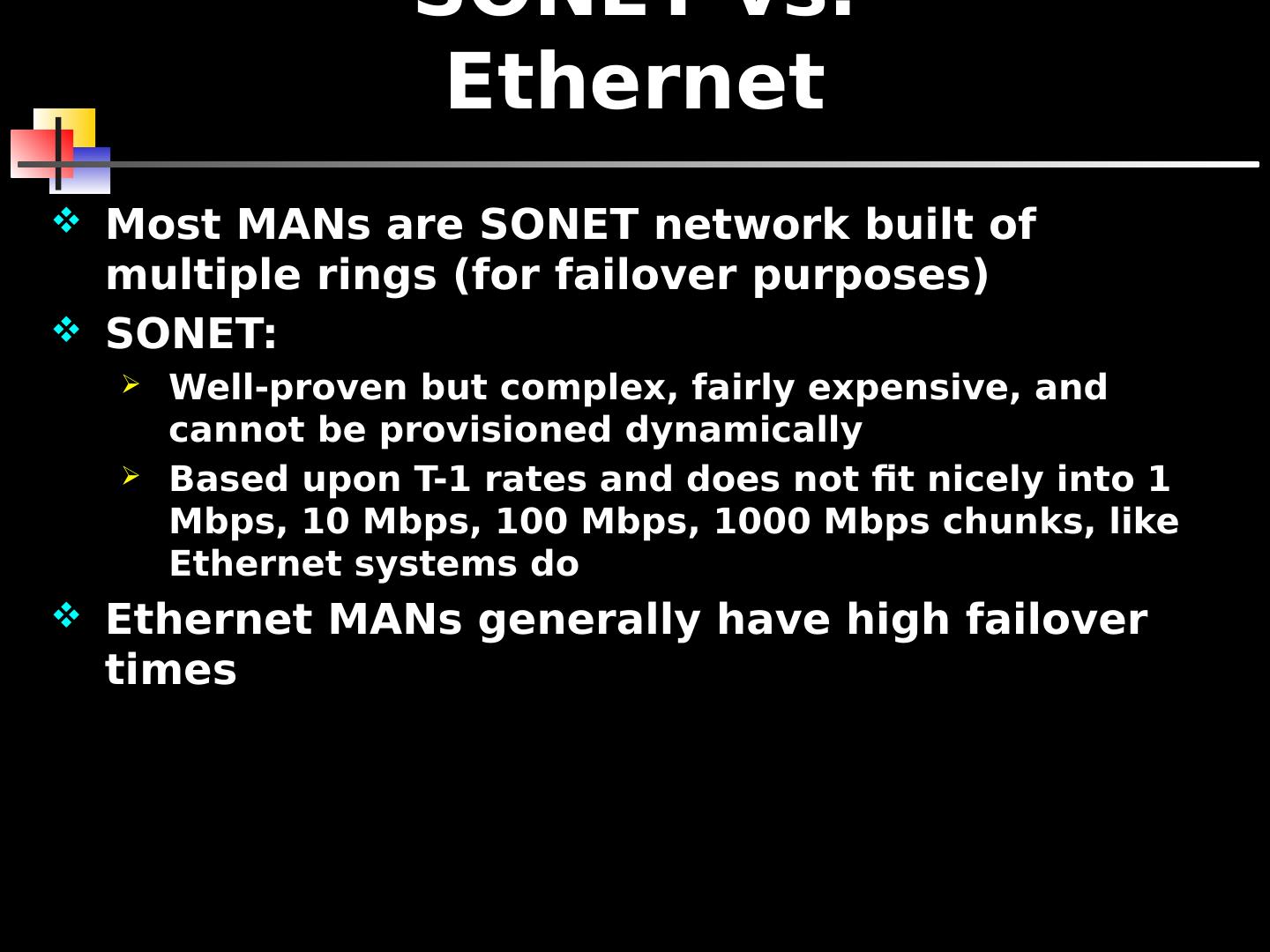 4 .SONET vs. Ethernet Most MANs are SONET network built of multiple rings (for failover purposes) SONET: Well-proven but complex, fairly expensive, and cannot be provisioned dynamically Based upon T-1 rates and does not fit nicely into 1 Mbps, 10 Mbps, 100 Mbps, 1000 Mbps chunks, like Ethernet systems do Ethernet MANs generally have high failover times