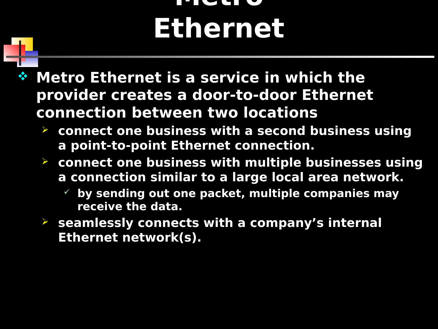 6 .Metro Ethernet Metro Ethernet is a service in which the provider creates a door-to-door Ethernet connection between two locations connect one business with a second business using a point-to-point Ethernet connection. connect one business with multiple businesses using a connection similar to a large local area network. by sending out one packet, multiple companies may receive the data. seamlessly connects with a company’s internal Ethernet network(s).