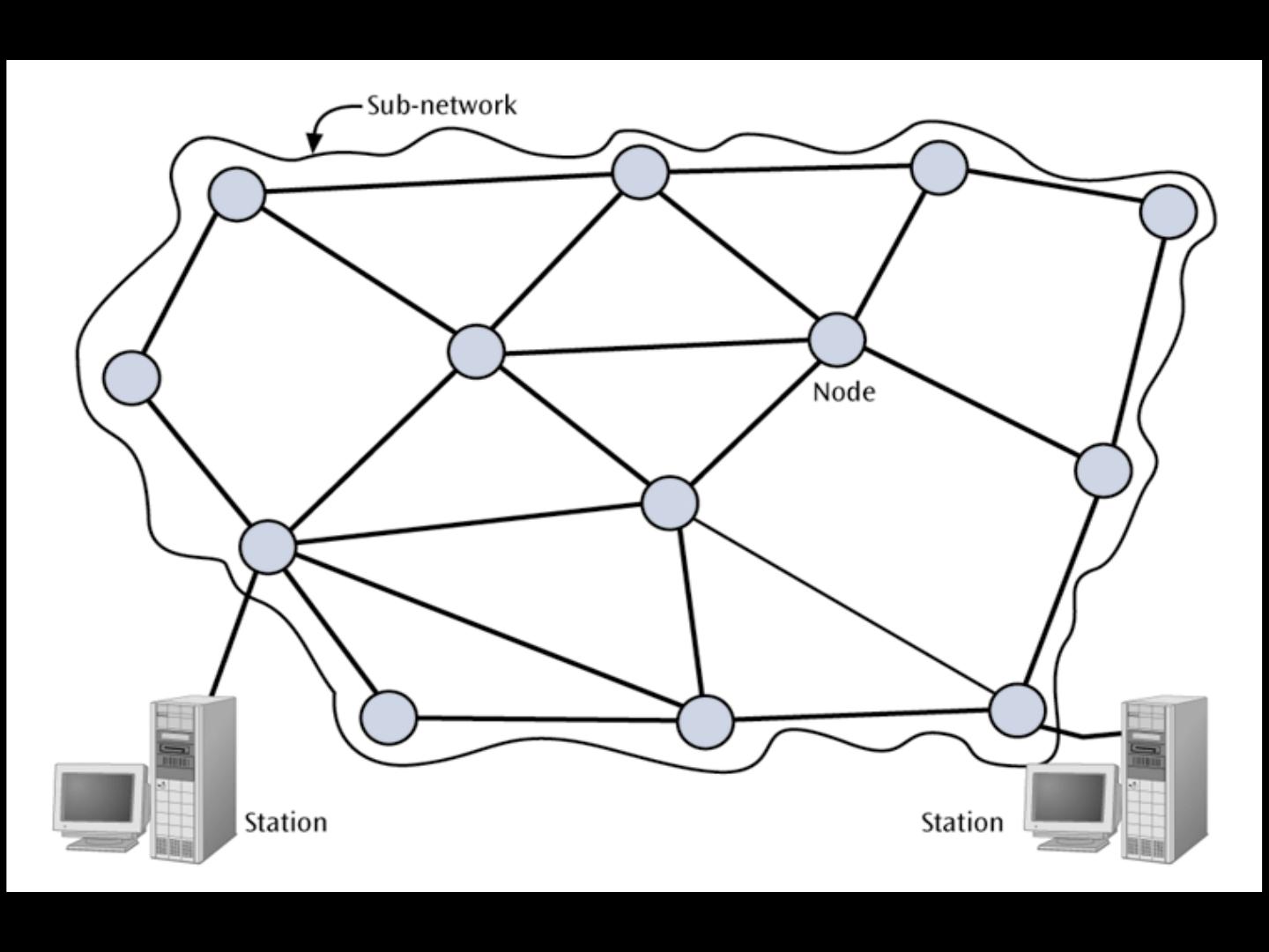 8 .WAN Basics WANs used to be characterized with slow, noisy lines Today WANs are very high speed with very low error rates WANs often follow a mesh topology Station – device that interfaces a user to a network Node – device that allows one or more stations to access the physical network and is a transfer point for passing information through a network A node is often a computer, router, or telephone switch Sub-network (or physical network) – underlying connection of nodes and telecommunication links