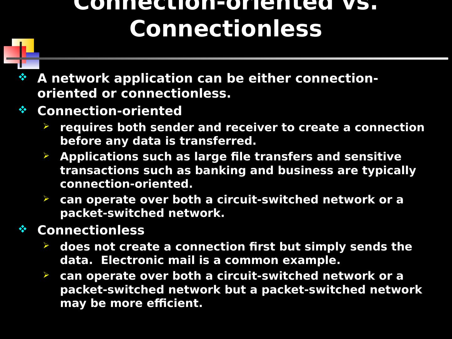 12 .Connection-oriented vs. Connectionless A network application can be either connection-oriented or connectionless. Connection-oriented requires both sender and receiver to create a connection before any data is transferred. Applications such as large file transfers and sensitive transactions such as banking and business are typically connection-oriented. can operate over both a circuit-switched network or a packet-switched network. Connectionless does not create a connection first but simply sends the data. Electronic mail is a common example. can operate over both a circuit-switched network or a packet-switched network but a packet-switched network may be more efficient.