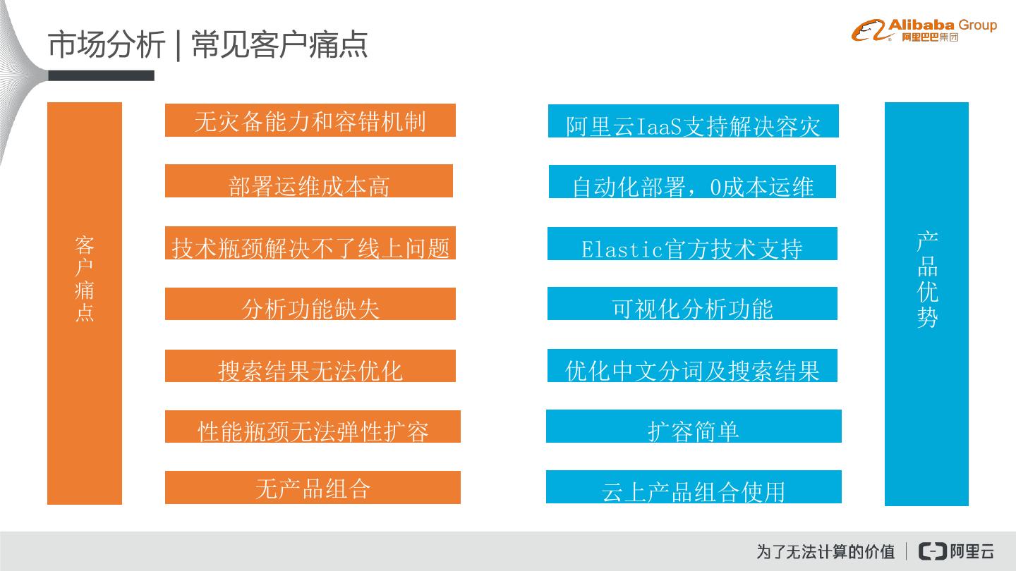 4 .市场分析 | 常见客户痛点 无灾备能力和容错机制 阿里云IaaS支持解决容灾 部署运维成本高 自动化部署,0成本运维 客 技术瓶颈解决不了线上问题 Elastic官方技术支持 产 户 品 痛 优 点 分析功能缺失 可视化分析功能 势 搜索结果无法优化 优化中文分词及搜索结果 性能瓶颈无法弹性扩容 扩容简单 无产品组合 云上产品组合使用