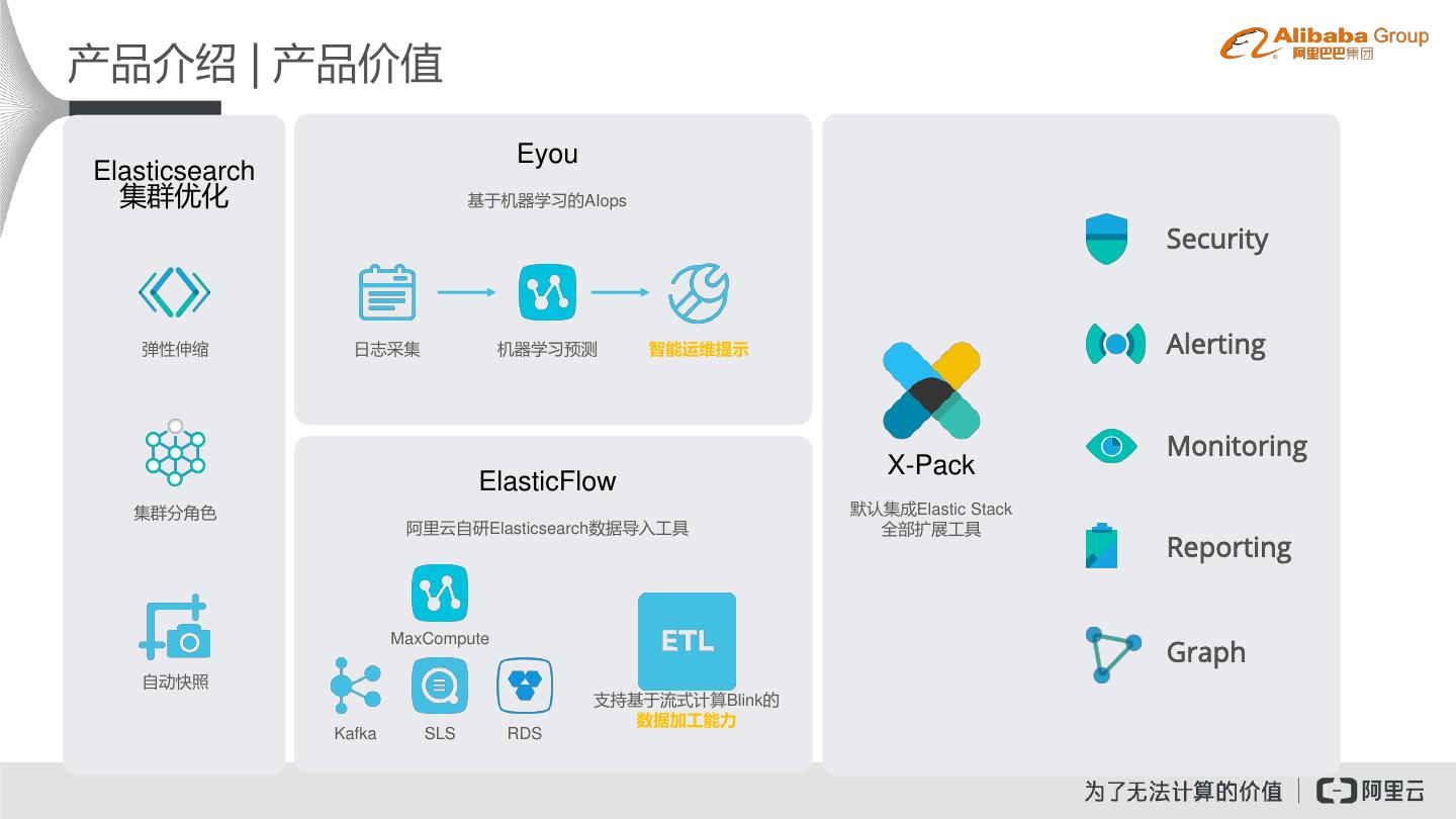 16 .产品介绍 | 产品价值 Eyou Elasticsearch 集群优化 基于机器学习的AIops Security 弹性伸缩 日志采集 机器学习预测 智能运维提示 Alerting Monitoring X-Pack ElasticFlow 集群分角色 默认集成Elastic Stack 阿里云自研Elasticsearch数据导入工具 全部扩展工具 Reporting MaxCompute Graph 自动快照 支持基于流式计算Blink的 数据加工能力 Kafka SLS RDS