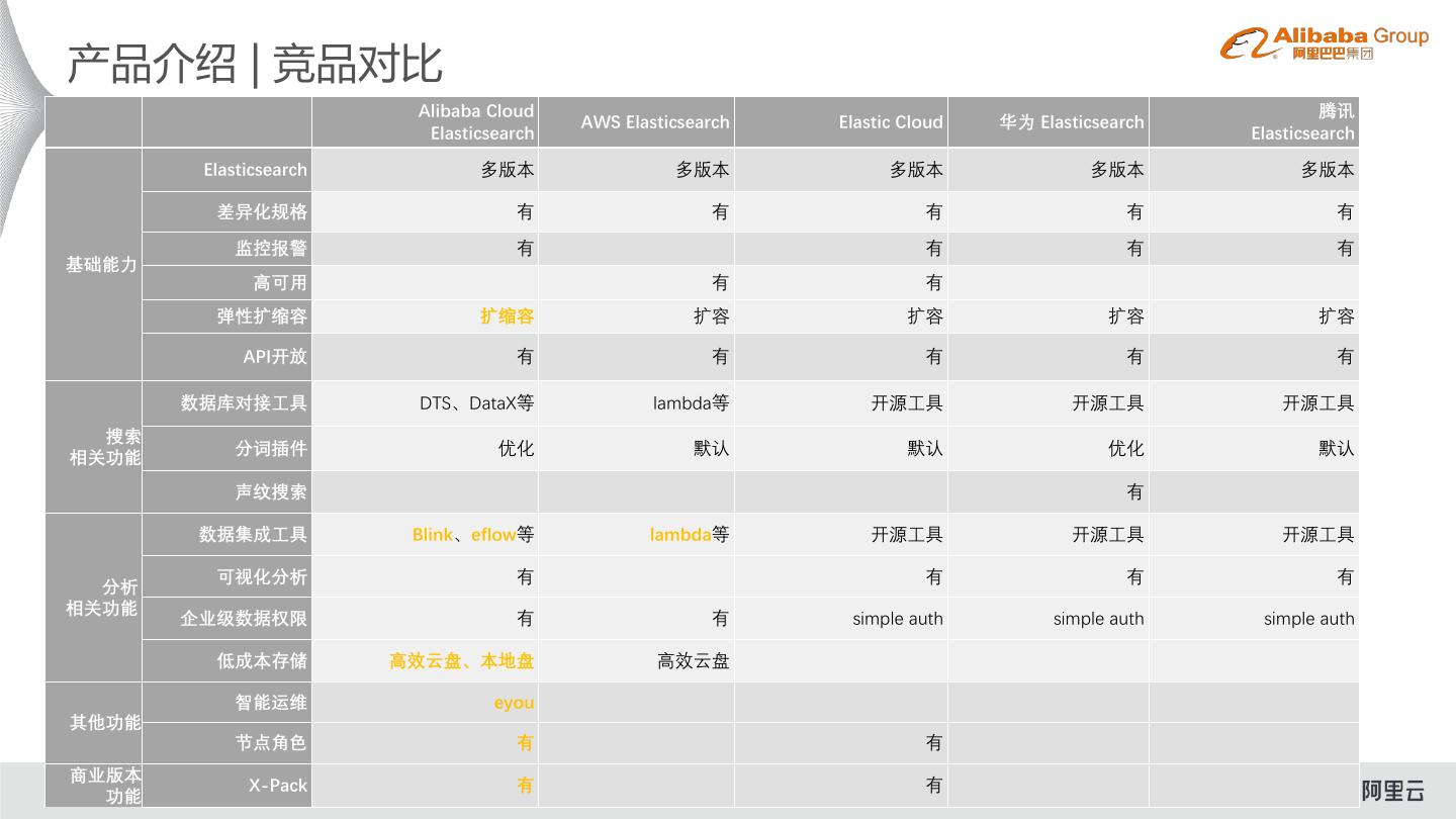 17 .产品介绍 | 竞品对比 Alibaba Cloud 腾讯 AWS Elasticsearch Elastic Cloud 华为 Elasticsearch Elasticsearch Elasticsearch Elasticsearch 多版本 多版本 多版本 多版本 多版本 差异化规格 有 有 有 有 有 监控报警 有 有 有 有 基础能力 高可用 有 有 弹性扩缩容 扩缩容 扩容 扩容 扩容 扩容 API开放 有 有 有 有 有 数据库对接工具 DTS、DataX等 lambda等 开源工具 开源工具 开源工具 搜索 分词插件 优化 默认 默认 优化 默认 相关功能 声纹搜索 有 数据集成工具 Blink、eflow等 lambda等 开源工具 开源工具 开源工具 可视化分析 有 有 有 有 分析 相关功能 企业级数据权限 有 有 simple auth simple auth simple auth 低成本存储 高效云盘、本地盘 高效云盘 智能运维 eyou 其他功能 节点角色 有 有 商业版本 X-Pack 有 有 功能