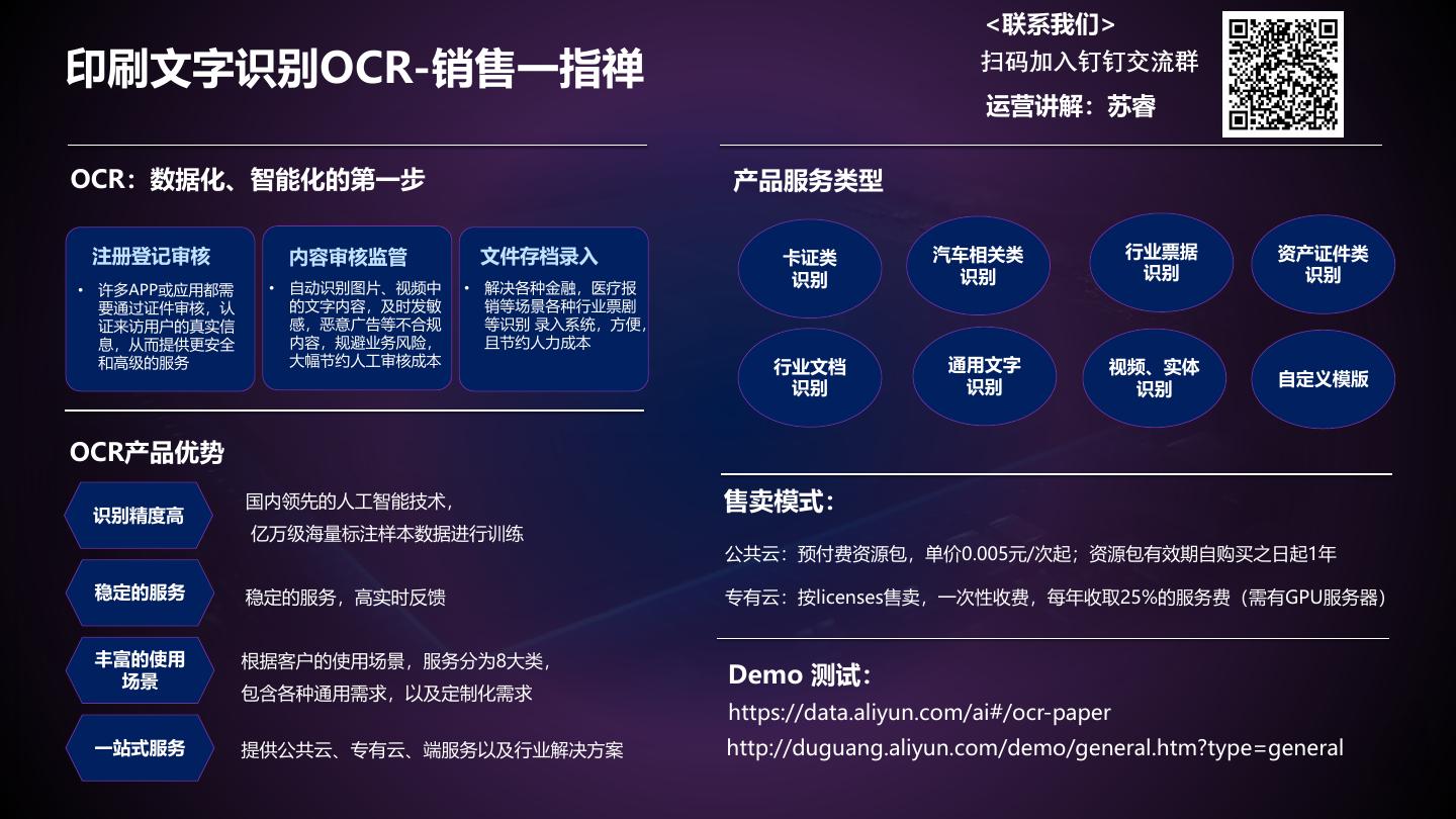 25 . <联系我们> 印刷文字识别OCR-销售一指禅 扫码加入钉钉交流群 运营讲解:苏睿 OCR:数据化、智能化的第一步 产品服务类型 注册登记审核 内容审核监管 文件存档录入 卡证类 汽车相关类 行业票据 资产证件类 识别 识别 识别 识别 • 许多APP或应用都需 • 自动识别图片、视频中 • 解决各种金融,医疗报 要通过证件审核,认 的文字内容,及时发敏 销等场景各种行业票剧 证来访用户的真实信 感,恶意广告等不合规 等识别 录入系统,方便, 息,从而提供更安全 内容,规避业务风险, 且节约人力成本 和高级的服务 大幅节约人工审核成本 行业文档 通用文字 视频、实体 识别 自定义模版 识别 识别 OCR产品优势 识别精度高 国内领先的人工智能技术, 售卖模式: 亿万级海量标注样本数据进行训练 公共云:预付费资源包,单价0.005元/次起;资源包有效期自购买之日起1年 稳定的服务 稳定的服务,高实时反馈 专有云:按licenses售卖,一次性收费,每年收取25%的服务费(需有GPU服务器) 丰富的使用 根据客户的使用场景,服务分为8大类, 场景 Demo 测试: 包含各种通用需求,以及定制化需求 https://data.aliyun.com/ai#/ocr-paper 一站式服务 提供公共云、专有云、端服务以及行业解决方案 http://duguang.aliyun.com/demo/general.htm?type=general