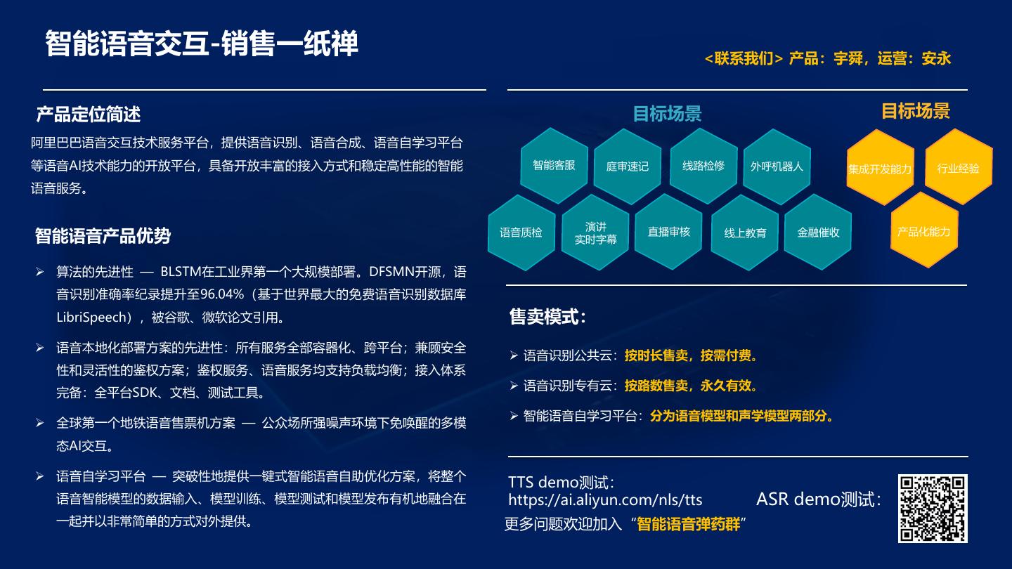27 . 智能语音交互-销售一纸禅 <联系我们> 产品:宇舜,运营:安永 产品定位简述 目标场景 目标场景 阿里巴巴语音交互技术服务平台,提供语音识别、语音合成、语音自学习平台 等语音AI技术能力的开放平台,具备开放丰富的接入方式和稳定高性能的智能 智能客服 庭审速记 线路检修 外呼机器人 集成开发能力 行业经验 语音服务。 演讲 智能语音产品优势 语音质检 实时字幕 直播审核 线上教育 金融催收 产品化能力 算法的先进性 — BLSTM在工业界第一个大规模部署。DFSMN开源,语 音识别准确率纪录提升至96.04%(基于世界最大的免费语音识别数据库 LibriSpeech),被谷歌、微软论文引用。 售卖模式: 语音本地化部署方案的先进性:所有服务全部容器化、跨平台;兼顾安全 语音识别公共云:按时长售卖,按需付费。 性和灵活性的鉴权方案;鉴权服务、语音服务均支持负载均衡;接入体系 语音识别专有云:按路数售卖,永久有效。 完备:全平台SDK、文档、测试工具。 智能语音自学习平台:分为语音模型和声学模型两部分。 全球第一个地铁语音售票机方案 — 公众场所强噪声环境下免唤醒的多模 态AI交互。 语音自学习平台 — 突破性地提供一键式智能语音自助优化方案,将整个 TTS demo测试: 语音智能模型的数据输入、模型训练、模型测试和模型发布有机地融合在 https://ai.aliyun.com/nls/tts ASR demo测试: 一起并以非常简单的方式对外提供。 更多问题欢迎加入“智能语音弹药群”