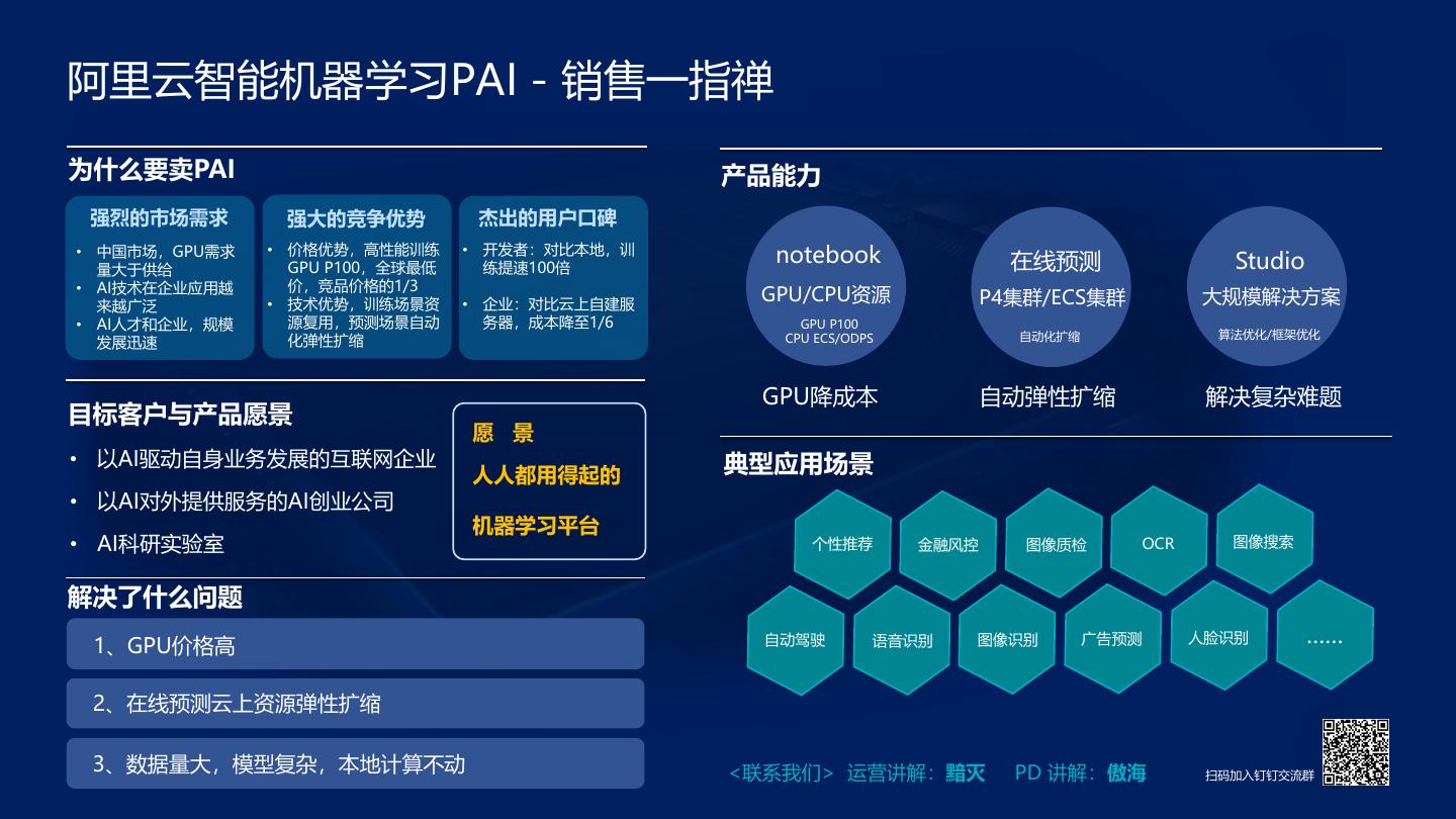 28 .阿里云智能机器学习PAI - 销售一指禅 为什么要卖PAI 产品能力 强烈的市场需求 强大的竞争优势 杰出的用户口碑 • 价格优势,高性能训练 • 开发者:对比本地,训 • 中国市场,GPU需求 量大于供给 GPU P100,全球最低 练提速100倍 notebook 在线预测 Studio • AI技术在企业应用越 价,竞品价格的1/3 • 技术优势,训练场景资 • 企业:对比云上自建服 GPU/CPU资源 P4集群/ECS集群 大规模解决方案 来越广泛 • AI人才和企业,规模 源复用,预测场景自动 务器,成本降至1/6 GPU P100 自动化扩缩 算法优化/框架优化 发展迅速 化弹性扩缩 CPU ECS/ODPS GPU降成本 自动弹性扩缩 解决复杂难题 目标客户与产品愿景 愿 景 • 以AI驱动自身业务发展的互联网企业 典型应用场景 人人都用得起的 • 以AI对外提供服务的AI创业公司 机器学习平台 • AI科研实验室 个性推荐 金融风控 图像质检 OCR 图像搜索 解决了什么问题 1、GPU价格高 自动驾驶 语音识别 图像识别 广告预测 人脸识别 …… 2、在线预测云上资源弹性扩缩 3、数据量大,模型复杂,本地计算不动 <联系我们> 运营讲解:黯灭 PD 讲解:傲海 扫码加入钉钉交流群