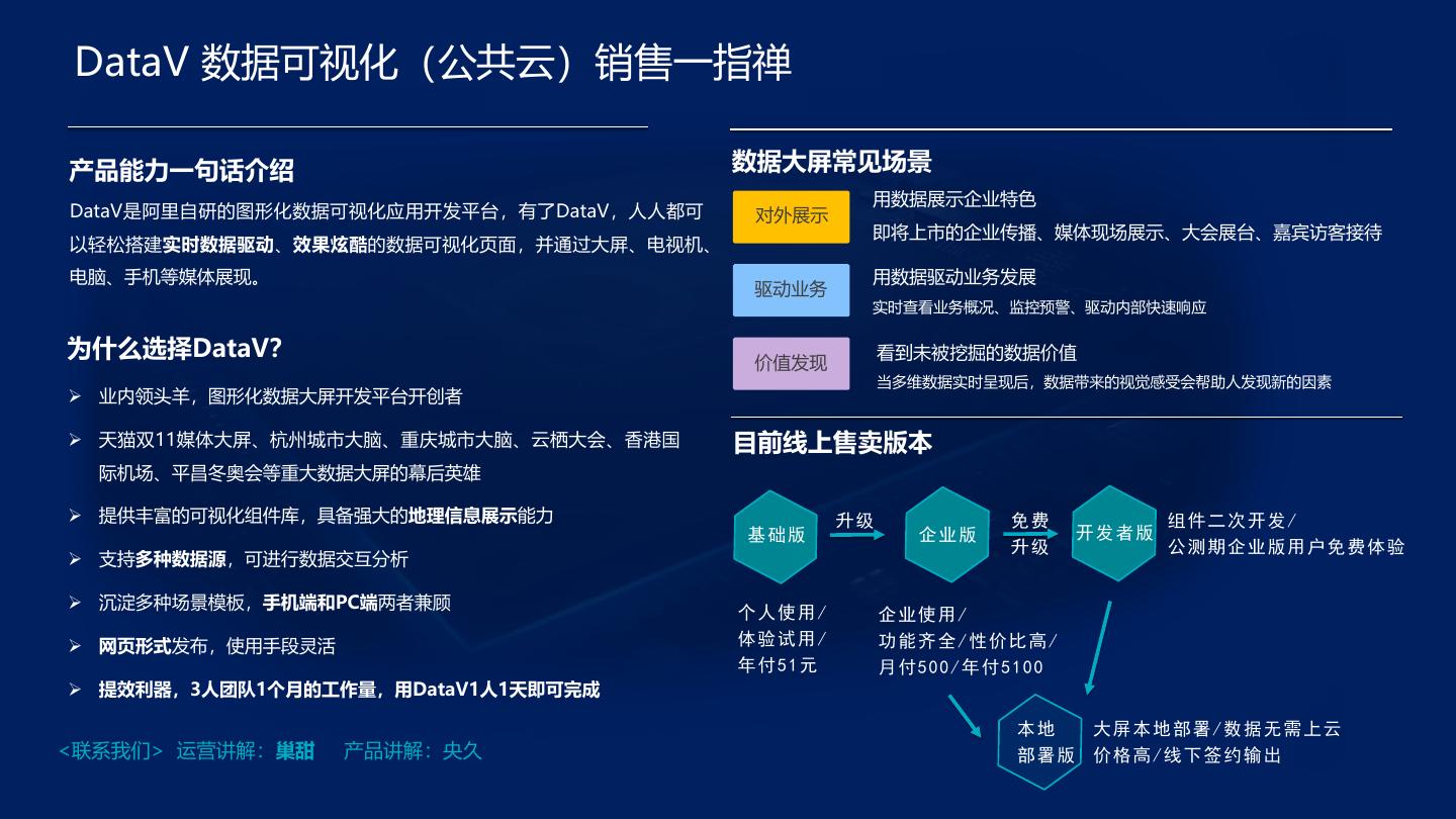 29 .DataV 数据可视化(公共云)销售一指禅 产品能力一句话介绍 数据大屏常见场景 用数据展示企业特色 DataV是阿里自研的图形化数据可视化应用开发平台,有了DataV,人人都可 对外展示 即将上市的企业传播、媒体现场展示、大会展台、嘉宾访客接待 以轻松搭建实时数据驱动、效果炫酷的数据可视化页面,并通过大屏、电视机、 电脑、手机等媒体展现。 用数据驱动业务发展 驱动业务 实时查看业务概况、监控预警、驱动内部快速响应 为什么选择DataV? 价值发现 看到未被挖掘的数据价值 当多维数据实时呈现后,数据带来的视觉感受会帮助人发现新的因素 业内领头羊,图形化数据大屏开发平台开创者 天猫双11媒体大屏、杭州城市大脑、重庆城市大脑、云栖大会、香港国 目前线上售卖版本 际机场、平昌冬奥会等重大数据大屏的幕后英雄 提供丰富的可视化组件库,具备强大的地理信息展示能力 升级 免费 组件二次开发/ 基础版 企业版 开发者版 升级 公测期企业版用户免费体验 支持多种数据源,可进行数据交互分析 沉淀多种场景模板,手机端和PC端两者兼顾 个人使用 / 企业使用 / 网页形式发布,使用手段灵活 体验试用 / 功能齐全 / 性价比高 / 年付51 元 月付500/ 年付5100 提效利器,3人团队1个月的工作量,用DataV1人1天即可完成 本地 大屏本地部署/数据无需上云 <联系我们> 运营讲解:巢甜 产品讲解:央久 部署版 价格高/线下签约输出