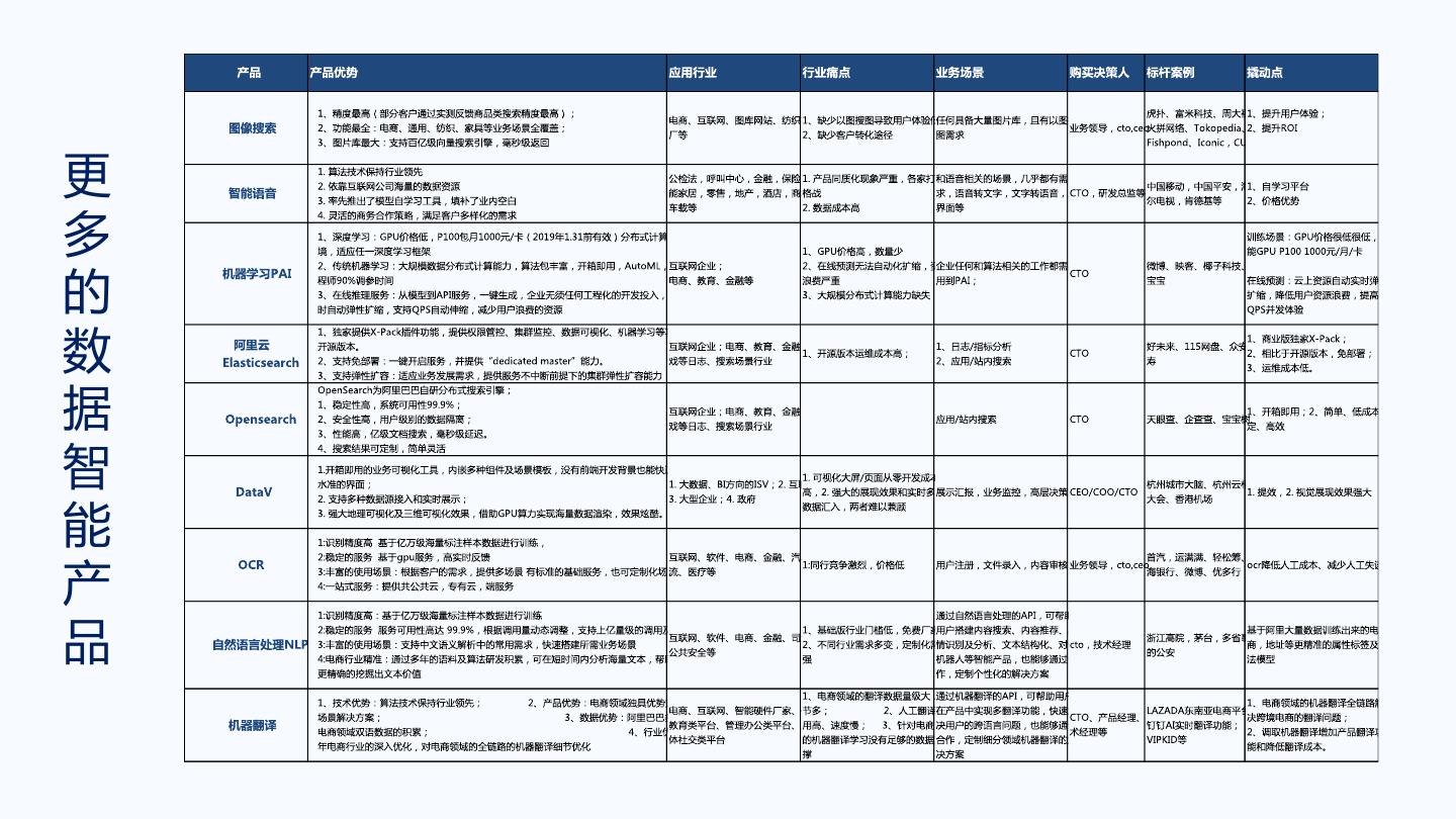 23 .“一图胜千言”图像搜索 – 销售一纸禅 为什么要卖图像搜索 行业竞对企业比较 厂商 价格策略 市场情况 优劣分析 国内垂直类电 客户需要更加 提升购买转化 互联网上各类 分为预付资源包,简单明了, 基于阿里巴巴电商拍立淘孵 低成本、轻交付、算法国际领 商和国外本土 便利、易用的 率,为客户创 型图片的数量 阿里云智能 提供免费试用 化出的搜索服务 先,售卖规格简单清晰 电商发展迅速 搜索方式 造直接效益 快速增加 导入和查询分开计费,容易混 免费测试期间 客户反馈算法准确度不如阿里, 百度 乱 积累部分用户 针对中大型客户而言价格偏高; 每月与最低消费,不适合量级 纺织布料行业为主,少量电 不能实时更新索引。API费用 码隆科技 目标客户与核心价值 较小的商家 商客户 过高;收费项多,计费复杂; 客户:技术精度不如我方; 目标客户 企业现状 核心需求 我们的价值 华为 按需计费和包月套餐相结合 产品上线晚,联合码隆输出 价格:中大型客户而言偏高 电商平台 技术能力储备无或 商品搜索/推荐 • 购买转化率提升 垂直/跨境/海外 不足 客户常见问题 图片Ip企业 • 提高搜索准确率 购物场景和使用体 相似图片推荐 是否需要单独购买ECS和GPU等基础资源? 是否存储客户的原始上传图片数据? 图库/论坛 验单一 • 优化购物体验 • 不需要。除了提供基本的AI能力外,也提供依赖的相关基础资源。 • 图像搜索产品需要客户自己在OSS中上传图库,并且不保存客户任何的 家居/装潢/制造业 无法给用户提供最 图片迅速查找 • 降低技术成本 是否一定需要单独购买OSS? 原始图片。 精准推荐 • 不是一定需要购买OSS。目前实例提供两种方式来导入数据,即实时导入 图片未存储在上海区域,是否影响使用图像搜索服务? 和离线导入。实时导入方式(调用API方式)适用于小规模、实时数据导 • 在导入阶段:实时导入时用户将图片post上传;离线导入时分增量和 典型 入。离线导入方式(OSS导入方式)适用于大规模、离线数据导入,需要 全量导入,都需要用户的OSS在上海区域;在查询阶段:当全部图片导 入到图像搜索服务,建立索引后,在任何区域都可以做检索查询。 应用 用户开通对象存储(OSS服务),并进行相应的授权。 电商/零售 工业用品 图库/影像 论坛 场景 项目联系 产品官网 官网地址: 电商软件 “一图胜千言”图像搜索销售弹药群 家居装潢 艺术/文物 纺织布料 其他 ai.aliyun.com/imagesearch 服务商 计费说明: 产品运营:安永 help.aliyun.com/document_detail/85153.html 产品经理:丹石