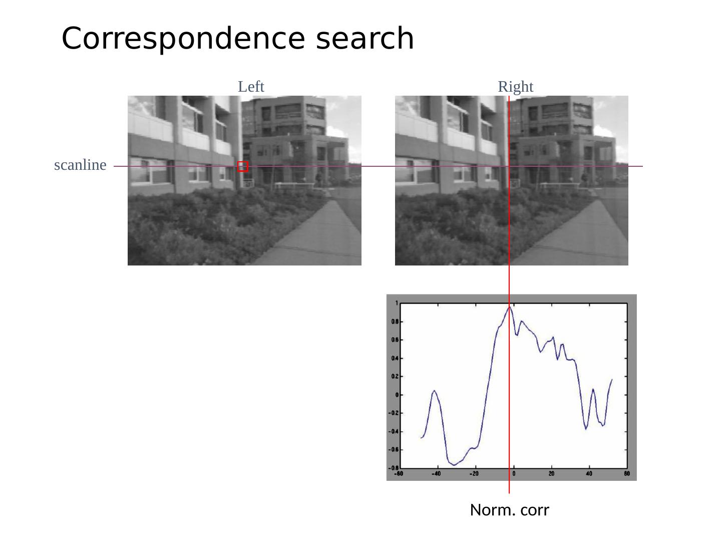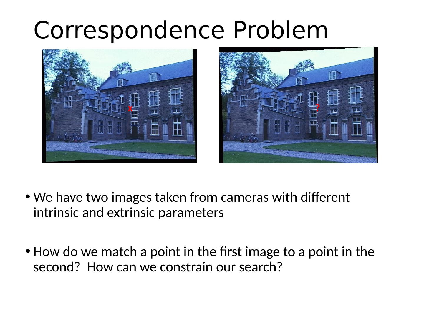 6 .Correspondence Problem We have two images taken from cameras with different intrinsic and extrinsic parameters How do we match a point in the first image to a point in the second? How can we constrain our search? x ?