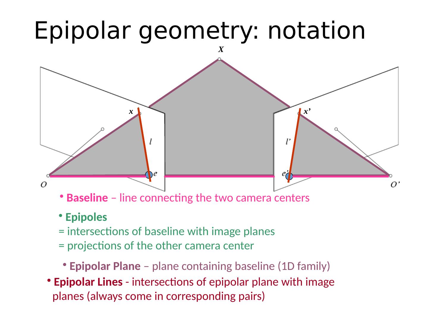 9 . Epipolar Plane – plane containing baseline (1D family) Epipoles = intersections of baseline with image planes = projections of the other camera center Baseline – line connecting the two camera centers Epipolar geometry: notation X x x’