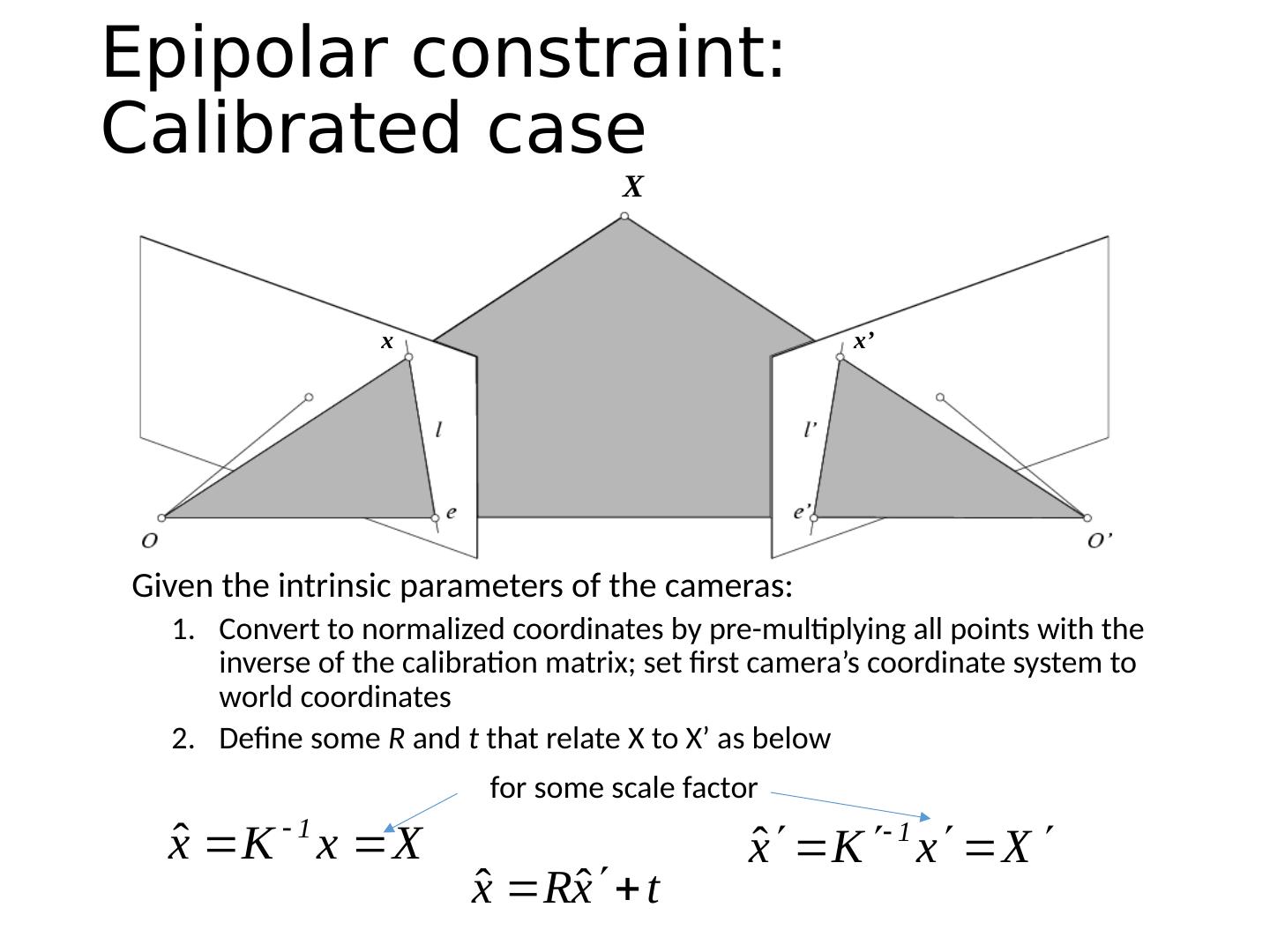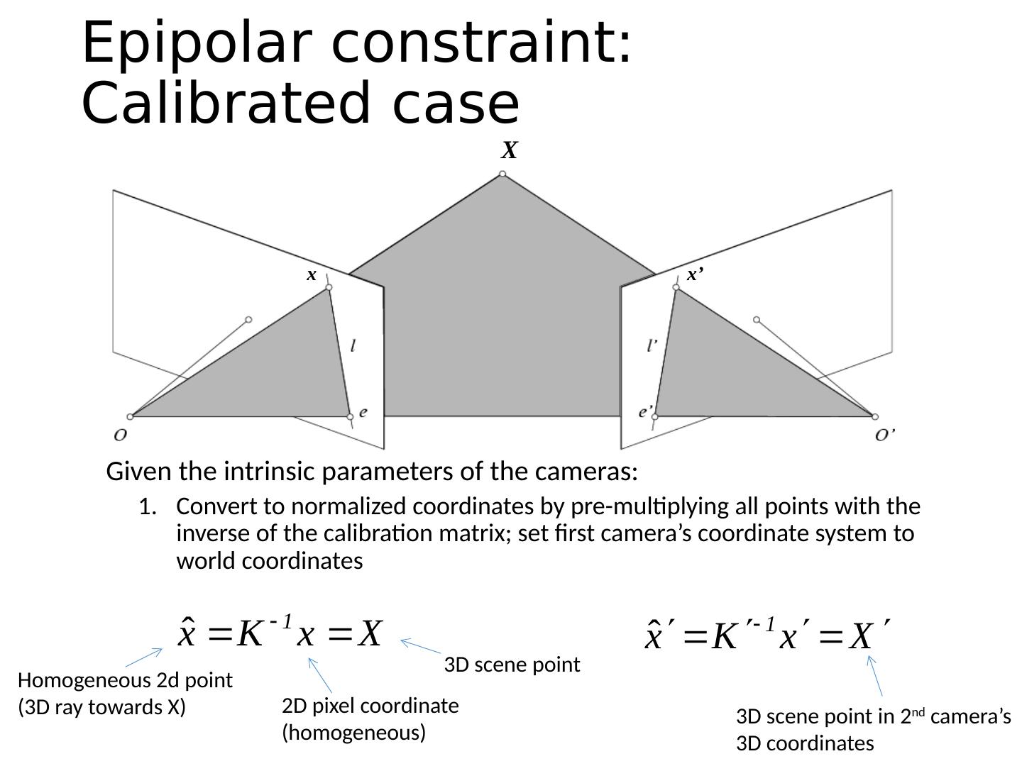 15 .X x x’ Epipolar constraint: Calibrated case Given the intrinsic parameters of the cameras : Convert to normalized coordinates by pre-multiplying all points with the inverse of the calibration matrix; set first camera’s coordinate system to world coordinates Homogeneous 2d point (3D ray towards X) 2D pixel coordinate (homogeneous) 3D scene point 3D scene point in 2 nd camera’s 3D coordinates
